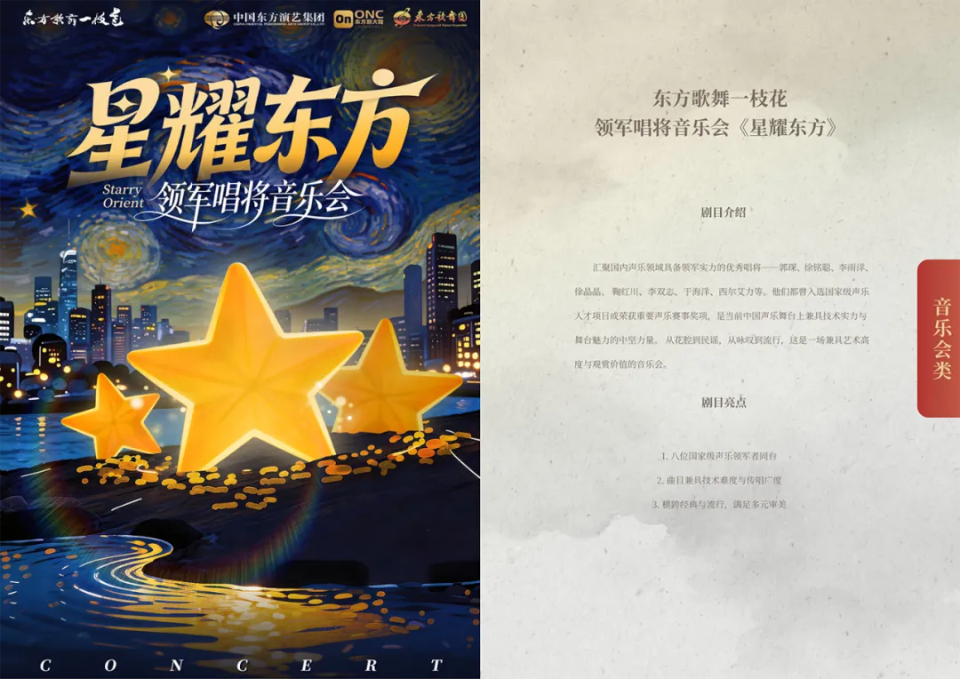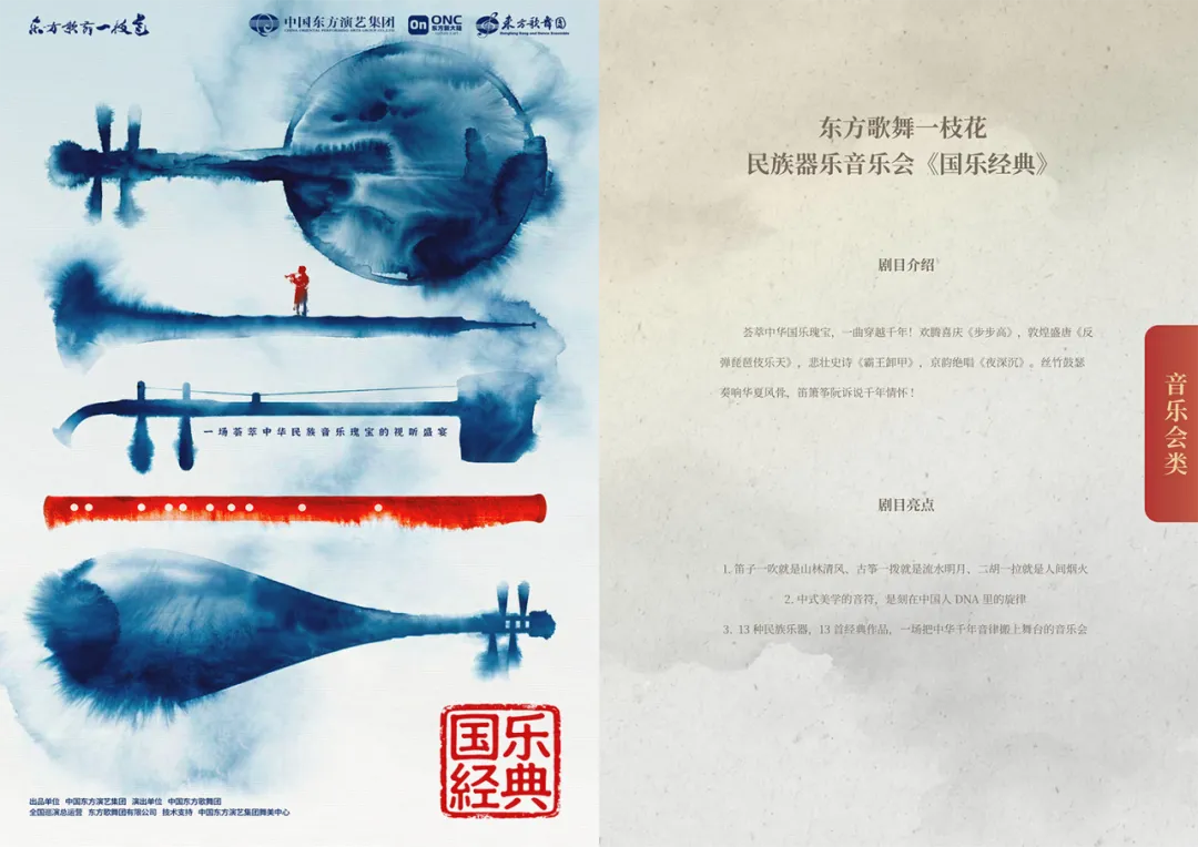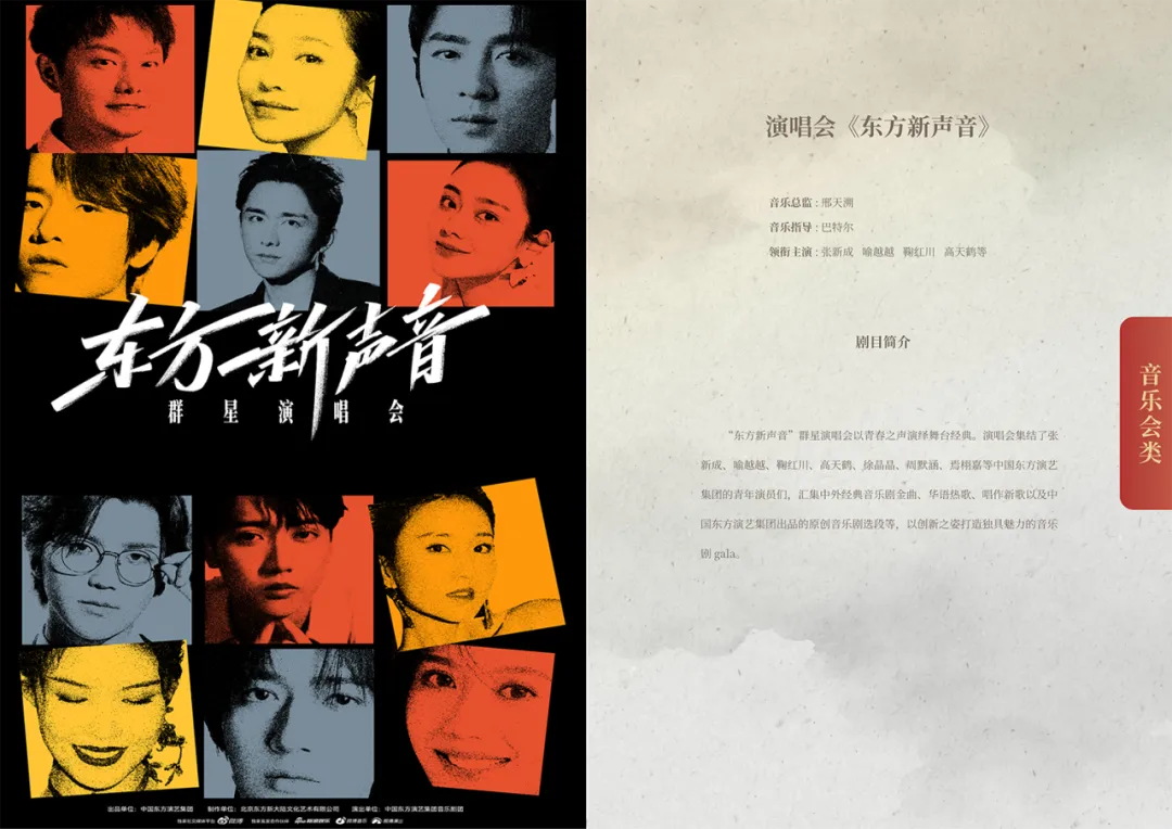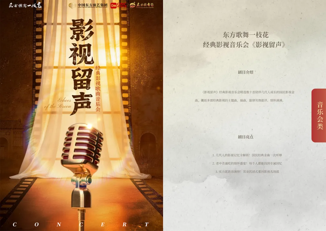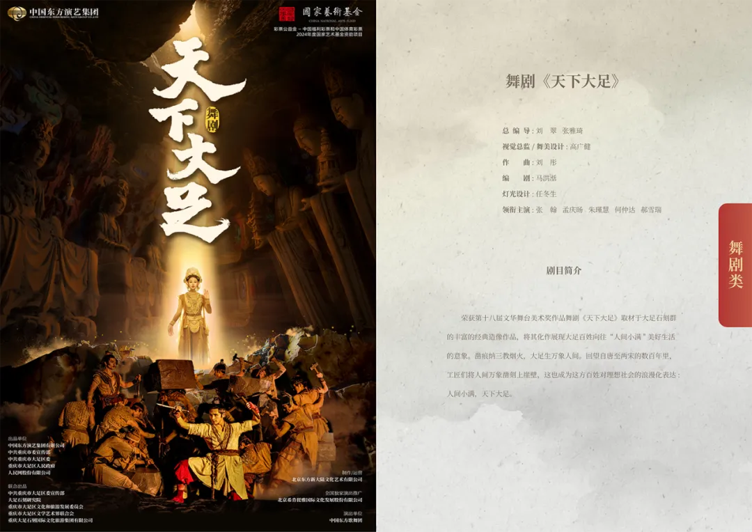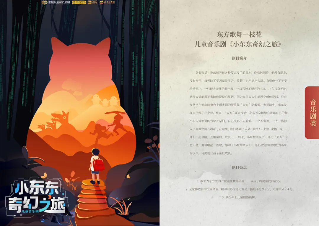 中国东方演艺集团以音乐舞蹈创作和演出作为龙头牵引,围绕艺术创作、各类演出、对外交流、艺术教育、文旅融合、数字创新、剧院运营七大业务板块,努力实现艺术创新、事业发展,做到 " 双效统一”。近年来,创作了舞蹈诗剧《只此青绿》、现代舞诗剧《诗忆东坡》、舞剧《天下大足》《永乐未央》《海的一半》《孩儿枕·家和兴》《唯我青白》、音乐剧《飞天》《大江东去》《绽放》《星辰》《寻找李二狗》《将进酒》《潮起东方》、音乐会《江山竞秀》、国潮雅读《乐·界》、舞蹈诗画《国色》、舞乐《中国故事·十二生肖》、古筝情境音画《如梦令》、歌舞剧场《美美与共》等一批舞台艺术精品。作品荣获文华大奖、“五个一工程”优秀作品奖、社会效益和经济效益相统一十大精品演出项目等多个奖项。出品电影《只此青绿》,推动舞台艺术与现代电影艺术跨界融合。