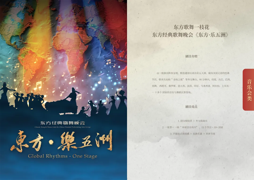 中国东方演艺集团有限公司是文化和旅游部主管并由财政部承担出资人职责的国家级演艺文化集团。其前身——中央歌舞团、东方歌舞团、中国轻音乐团,是在历代党和国家领导人亲切关怀下创建的新中国最负盛名的国家级艺术院团,集中代表了我国音乐舞蹈艺术的最高成就,涌现出众多享誉海内外的杰出艺术家,创作演出了众多深受中外观众喜爱的优秀艺术作品,足迹遍布祖国的四面八方,代表中国出访过五大洲百余个国家和地区,多次参加重要国事演出,为增进中国和世界各国的友谊和文化交流,发挥了 " 文化使节”的独特作用。