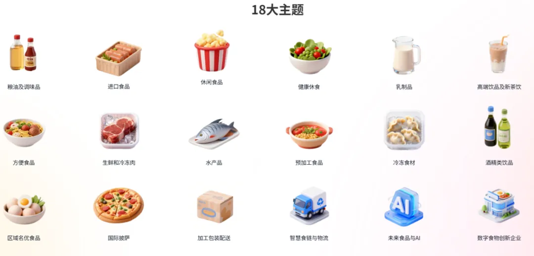 2026 SIAL西雅国际食品展(上海)特设18大主题,展品涵盖:进口食品、休闲食品、大健康食品、乳制品、粮油及调味品、方便食品、生鲜和冷冻肉、水产品、预加工食品、冷冻食材、高端饮品及新茶饮、酒精类饮品、区域名优食品、国际披萨、加工包装配送、智慧食链与物流、未来食品与AI、数字食物创新企业。