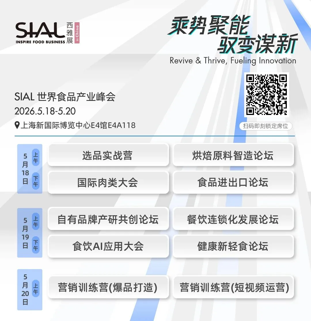 5月18日-20日,展会将同期举办第八届SIAL世界食品产业峰会,以传递食饮行业前沿资讯,破解当下行业痛点为核心,围绕主题“乘势聚能,驭变谋新”将举办10场聚焦细分品类的主题论坛,包括国际肉类大会、自有品牌产研共创论坛、食饮AI应用大会、营销训练营(爆品打造)、烘焙原料智造论坛、食品进出口论坛、餐饮连锁化发展论坛、健康新轻食论坛、营销训练营(短视频运营)、选品实战营,汇聚全球食饮行业智慧,从技术革新到模式创新,从供应链降本增效到品牌有效破局,为食饮人梳理穿越行业周期的破局思路,破解当下核心痛点!