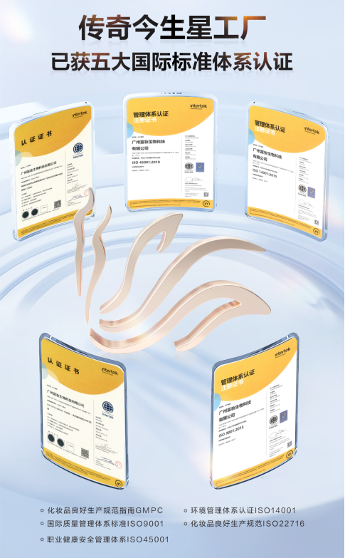 传奇今生自有工厂一一广州富妆生物科技有限公司,是一座1.3万平方米的智慧美妆工厂,工厂引进国际顶尖自动化生产设备与全面智能系统,所有生产步骤均在十万级GMP无尘洁净车间完成,所有化妆品制造用水只使用历经多重净化工序的超纯水,为产品奠定了稳定的品质基石。