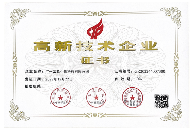 工厂更是通过了ISO22716、GMPC、ISO45001、ISO9001、ISO14001五大国际标准体系认证,并成功获得国家专利达20多项,包括产品发明、实用新型、产品外观设计等专利技术,更是荣获国家高新技术企业认证!
