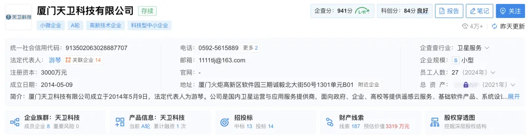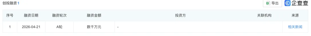 据企查查获悉,2026年4月21日,厦门天卫科技有限公司(以下简称:天卫科技)完成A轮融资,本轮投资方暂未公示,融资金额数千万。