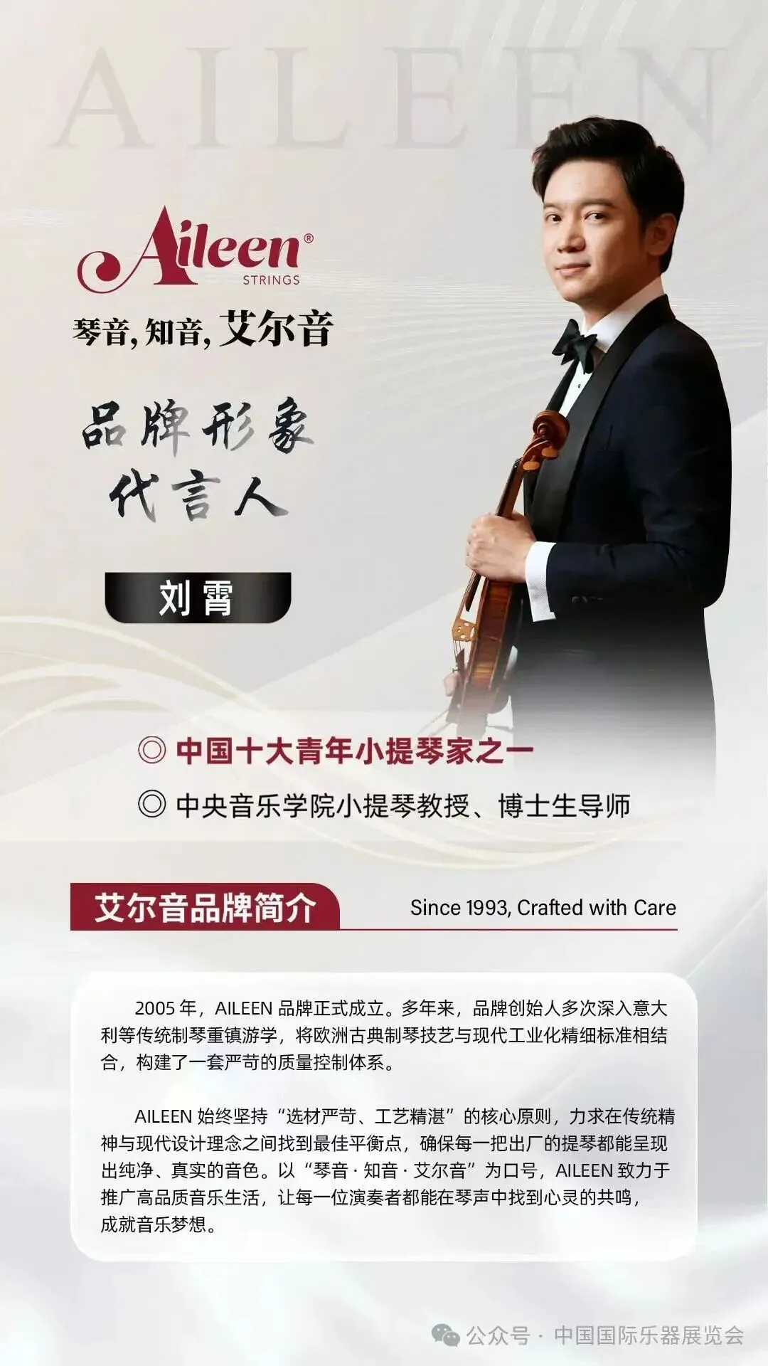 AILEEN 始终坚持“选材严苛、工艺精湛”的核心原则,力求在传统精神与现代设计理念之间找到最佳平衡点,确保每一把出厂的提琴都能呈现出纯净、真实的音色。以“琴音·知音·艾尔音”为口号,AILEEN 致力于推广高品质音乐生活,让每一位演奏者都能在琴声中找到心灵的共鸣,成就音乐梦想。