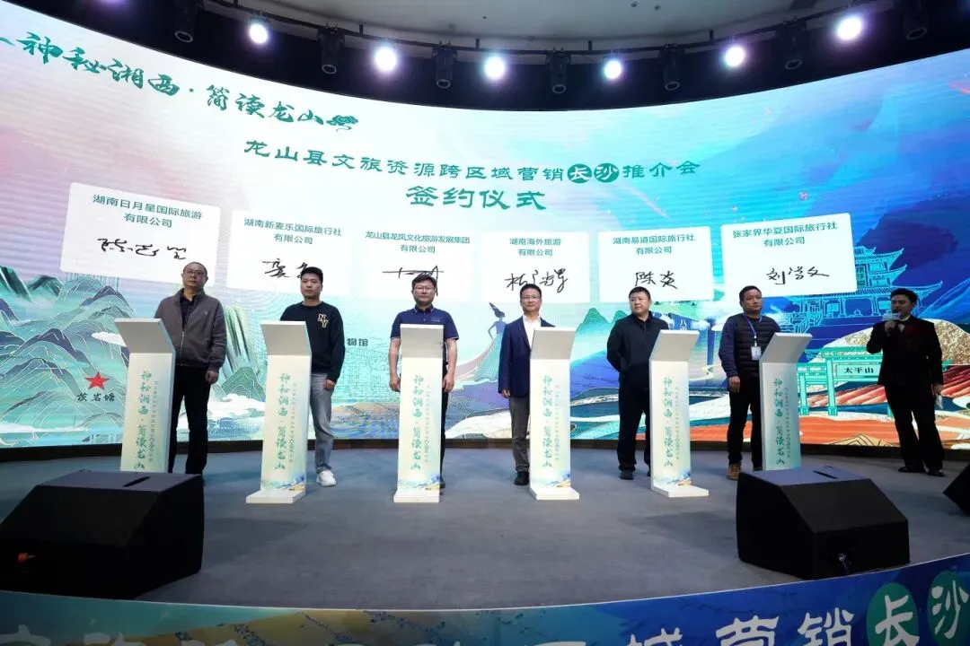 活动现场,龙山文旅集团与多家长沙旅行社举行签约仪式,围绕客源互送、线路共建、品牌共推达成深度合作,为两地文旅产业协同发展注入强劲动力。在《土家酒歌》的欢快旋律中,现场氛围热烈高涨,参会嘉宾纷纷点赞龙山资源与政策,表达赴龙山旅游、合作运营的强烈意愿。