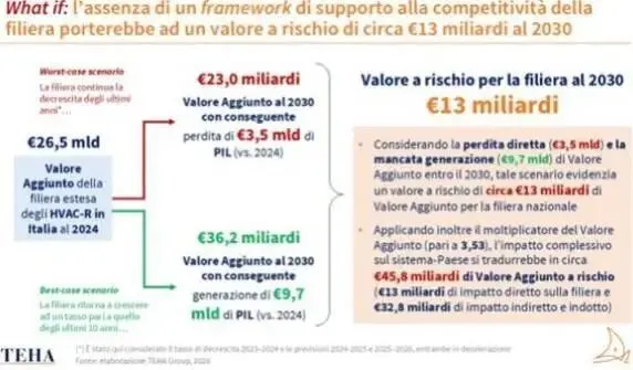 这项假设分析评估了在意大利缺乏支持暖通空调及制冷(HVAC+R)供应链竞争力的框架下可能产生的影响,并比较了两种不同的增值发展轨迹,以2024年的水平(相当于扩展供应链的265亿欧元)为起点,预测2030年该供应链的增值会如何变化。在最坏情况(无干预情景)中,假设供应链继续沿用最近的趋势,并考虑2023-2024年的下降率以及2024-2025年和2025-2026年的预测值(均呈下降趋势)。在这种轨迹下,到2030年,供应链的增值约为230亿欧元,与2024年相比,GDP可能减少35亿欧元。在最佳情况(干预情景)中,假设供应链恢复到过去10年的复合年均增长率(CAGR),与前十年相比,这是一个持续发展的轨迹。在这种情况下,到 2030 年,供应链的增加值可能达到约 362 亿欧元,相当于比 2024 年增加 97 亿欧元的国民生产总值。考虑到最坏情况下的直接损失(35 亿欧元)以及与最佳情况(97 亿欧元)相比增加值的不足,该情景表明,到 2030 年,供应链面临的增加值风险约为 130 亿欧元。