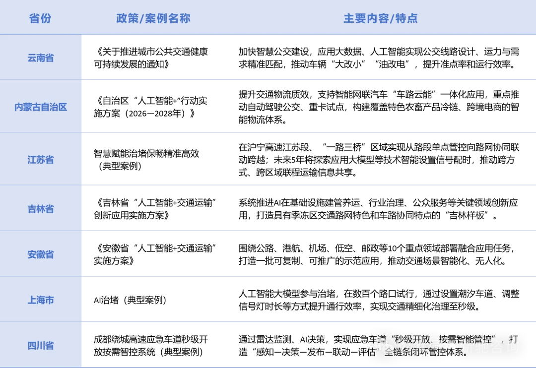 根据公开信息,近期各省在“人工智能+交通运输”领域的主要政策和典型案例如下: