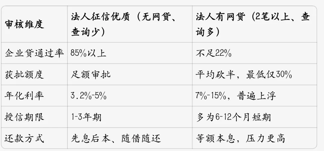 很多法人并非恶意借贷,而是被网贷的低门槛、便捷性误导,不知不觉毁掉企业融资路: 1、误将网商贷、借呗当作企业资金,实则计入个人负债,直接影响法人征信; 2、随手点击“测额度”“领取额度”,每一次都是贷款审批查询,3次就会让征信变花; 3、贪图秒批、无抵押,借几千、几万小额网贷,笔数累计后突破银行红线; 4、不看真实年化,只看日息万三、万四,实际综合利率远超银行贷,加重负债压力。 这些看似无伤大雅的操作,在企业需要大额、低息融资时,都会变成无法逾越的高墙。四、数据说话:法人征信达标 vs 不达标,融资差距有多大