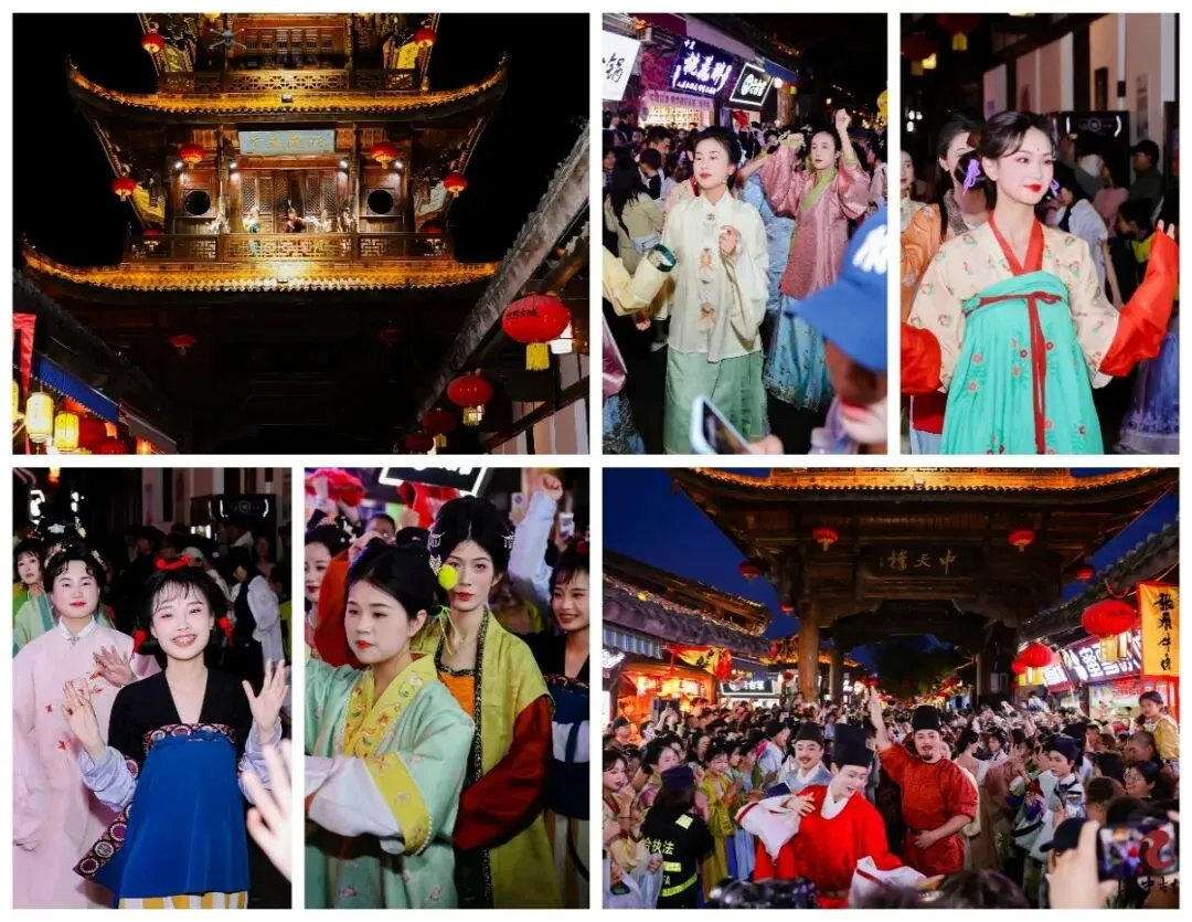 舞蹈表演岗位上,学子们身着传统汉服,身姿舒展、步履轻盈,将舞蹈与汉服元素、古城文化相结合,水袖翩跹间尽显国风雅致,为现场游客带来了一场兼具观赏性与文化性的视觉盛宴。