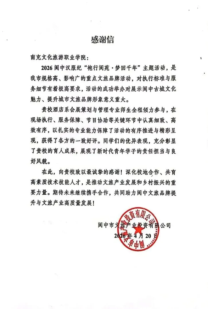 汉服纪圆满落幕之际,阆中古城相关部门特意发来感谢信,对酒店系会展策划与管理专业师生的辛勤付出表示衷心感谢。信中提到,学子们在现场执行、服务保障、节目协助等关键环节中认真细致、高效有序,以扎实的专业能力保障了活动的有序推进与精彩呈现,用青春力量为这场国风盛宴保驾护航,不仅圆满完成了各项任务,更以良好的精神风貌展现了新时代大学生的责任与担当,为阆中汉服纪的顺利开展注入了新鲜活力,也为千年古城的国风文旅发展增添了青春温度。