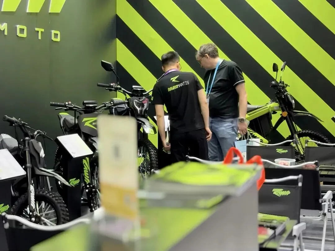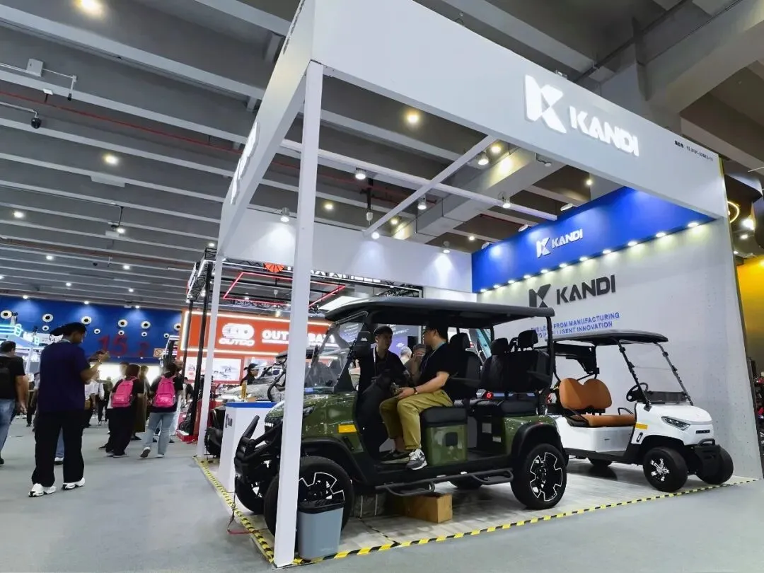 主展台的“Kandi”聚焦全域智能载具,覆盖高尔夫球车、UTV、组合冲浪板等多元化产品,锚定户外、休闲、园区等大众商用场景;另一侧的Rawrr展台则专门呈现主打性能与设计的高端电动摩托车,,以抢占海外高端两轮越野市场。