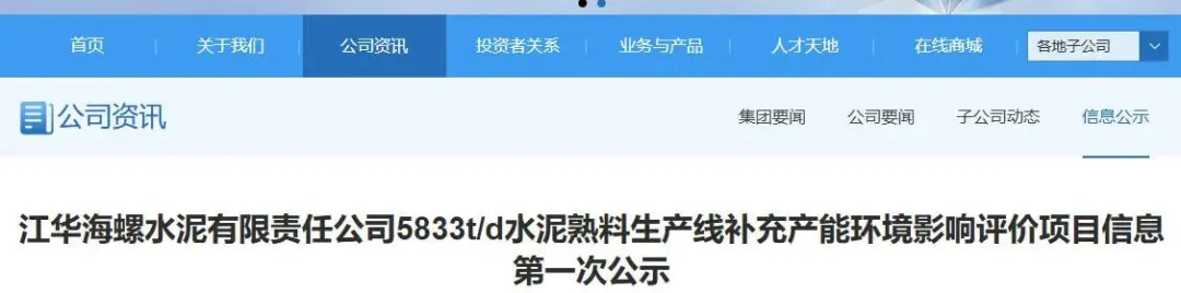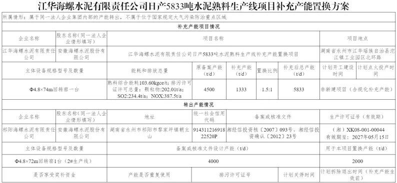 4月20日,江华海螺水泥有限责任公司对其5833吨/天水泥熟料生产线补充产能的环境影响评价项目信息进行首次公示。