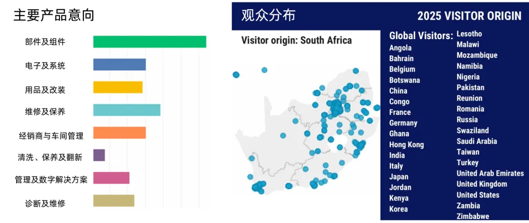 2025年南非汽配展共吸引307家参展商,促成2959场商业撮合会议,连接非洲及全球多地买家与供应商,观众覆盖主要非洲市场,以及德国、英国、中国、印度和阿联酋等全球市场。