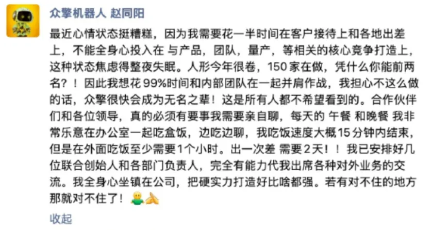 为了把时间和精力全部聚焦在内部核心能力打造上,赵同阳更是直接向合作伙伴和领导“喊话”,态度坚定又带着几分歉意:“真的必须有要事我需要亲自聊,每天的午餐和晚餐我非常乐意在办公室一起吃盒饭,边吃边聊,我吃饭速度大概15分钟内结束,但是在外面吃饭至少需要1个小时。出一次差需要2天。”