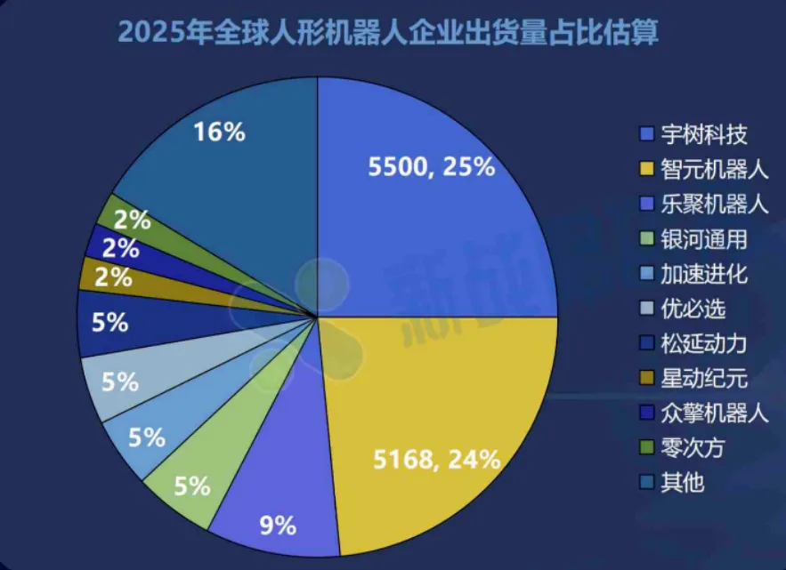 新战略移动机器人产业研究所和人形机器人场景应用联盟发布的《2025-2026年人形机器人产业发展研究报告》显示,2025年全球人形机器人企业出货量占比估算,宇树科技和智元机器人分别以5500台和5168台出货量位居前两位,分别占25%、24%,这两家企业组成的第一梯队则是断崖式领先。