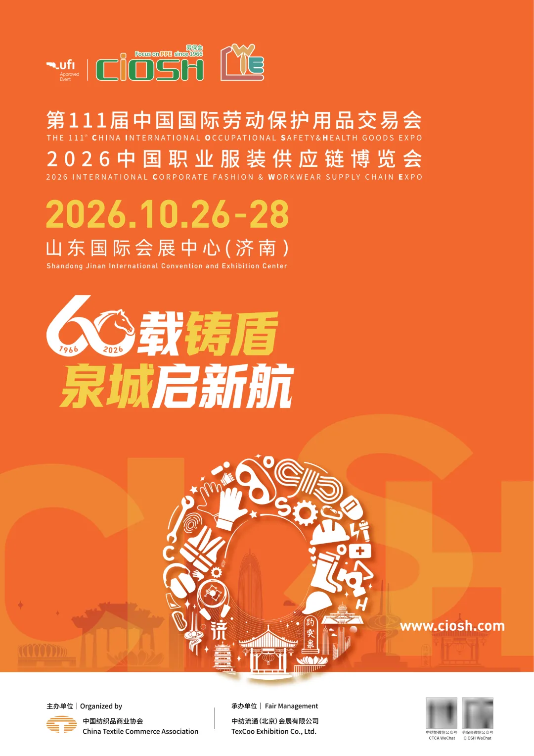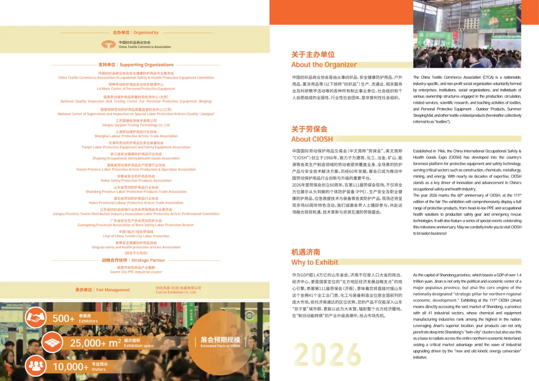 从1966年的初心启航,到2026年的甲子新章,中国国际劳动保护用品交易会(CIOSH,简称“劳保会”)历经百余届沉淀,已成为亚太地区规模最大、历史最悠久的专业安全防护盛会,更是引领行业发展、链接全球资源的核心枢纽。2026年10月26日-28日,第111届劳保会将重磅落地泉城济南,在山东国际会展中心盛大启幕,恰逢展会创办60周年的里程碑时刻,一场汇聚产业力量、解锁时代商机的行业盛宴正式开启招商,诚邀全球劳保同仁共赴之约,共筑安全防线,共启发展新程!