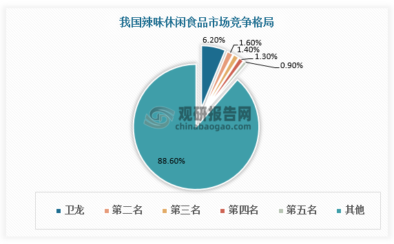 辣味休闲食品新老玩家同台竞技,市场高度分散,CR5为11.5%,其中卫龙市场份额排名第一,为6.2%,排名第五的品牌市占率仅0.9%。