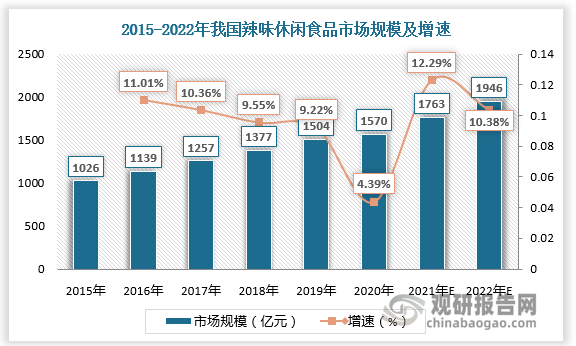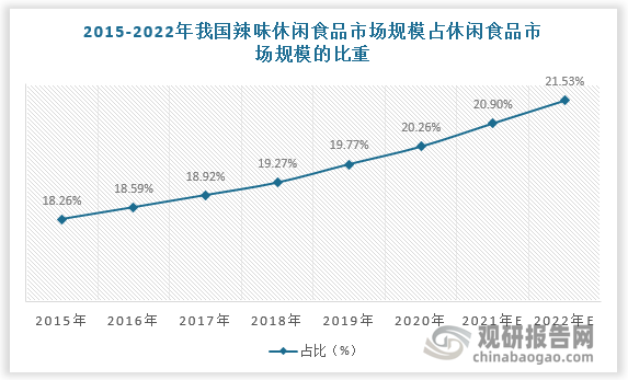 辣味休闲食品市场规模及在休闲食品市场规模中的占比也呈现增长态势。2015-2020年我国辣味休闲食品在休闲食品中的占比由18.26%增长至20.26%,2022年辣味休闲食品在休闲食品中的占比进一步提升至21.53%。