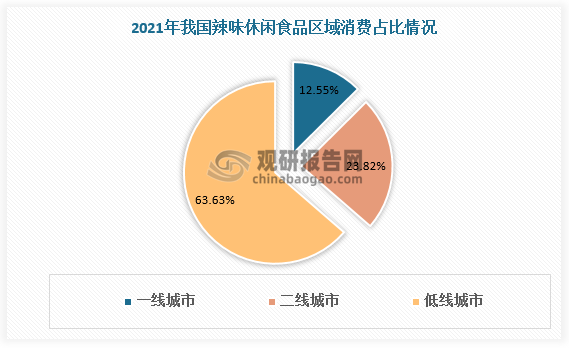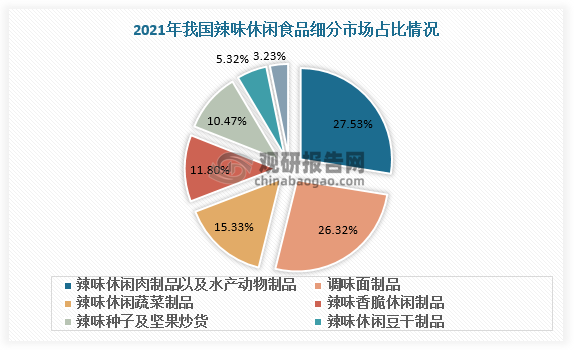 辣味休闲食品可分为辣味肉制以及水产动物制品、调味面制品、辣味休闲蔬菜制品、辣味香脆休闲食品、辣味种子及坚果炒货、辣味休闲豆干制品以及其他辣味休闲食品。其中辣味休闲肉制品以及水产动物制品、调味面制品、辣味休闲蔬菜制品消费占比较高,2021年分别为27.53%、26.32%、15.33%。此外,辣味香脆休闲制品、辣味种子及坚果炒货、辣味休闲豆干制品分别占比11.8%、10.47%、5.32%。