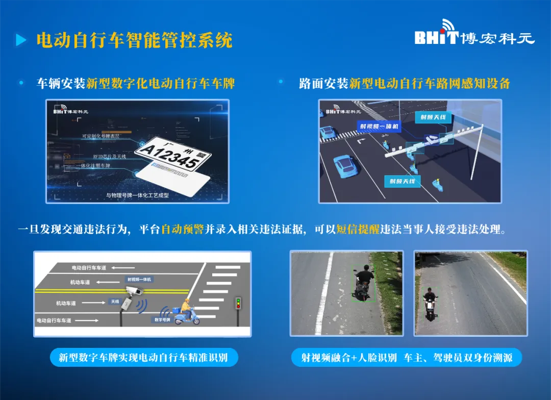 在本届交博会上,博宏科元重点展示的“电动自行车数字车牌及智能管控系统”贯穿“车牌生产—路面管控—社区防范—闭环处置”全业务流程。系统以嵌入RFID芯片的数字号牌为载体,结合路侧感知设备和云端管控平台,实时采集电动自行车行驶信息,精准识别闯红灯、逆行、占用机动车道等违法行为,并将信息同步推送至交管后台与骑手端。同时,系统拓展了智慧社区安全防控功能,可对电池入户充电等消防安全隐患进行监测预警,实现对电动自行车的精准溯源与全链条闭环管理。