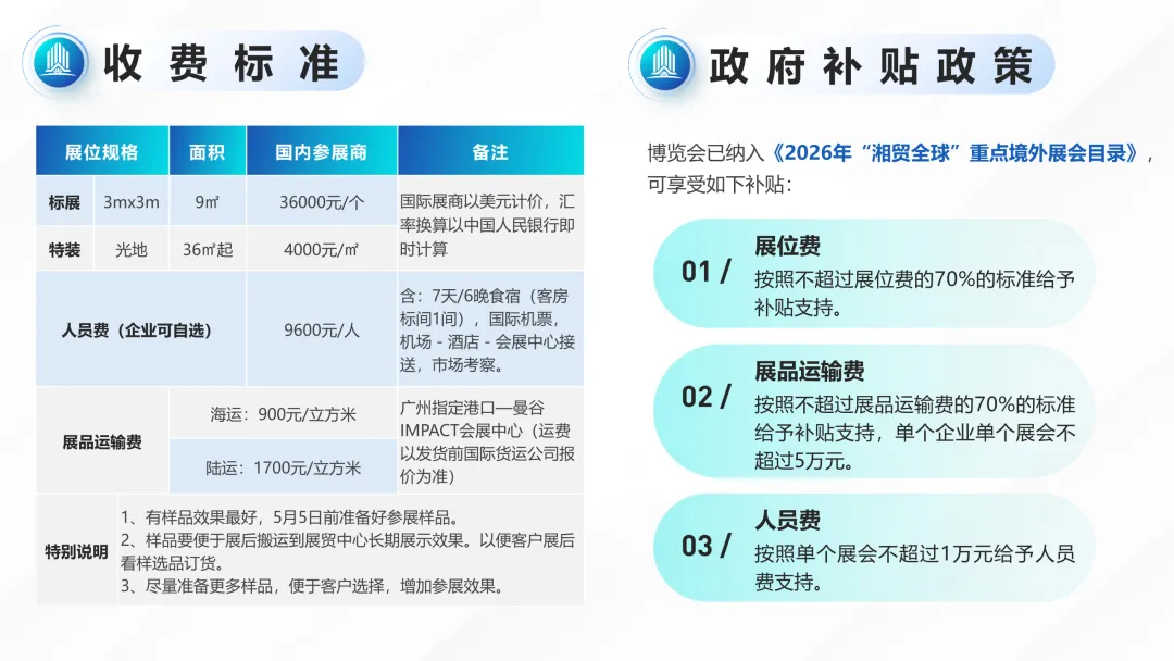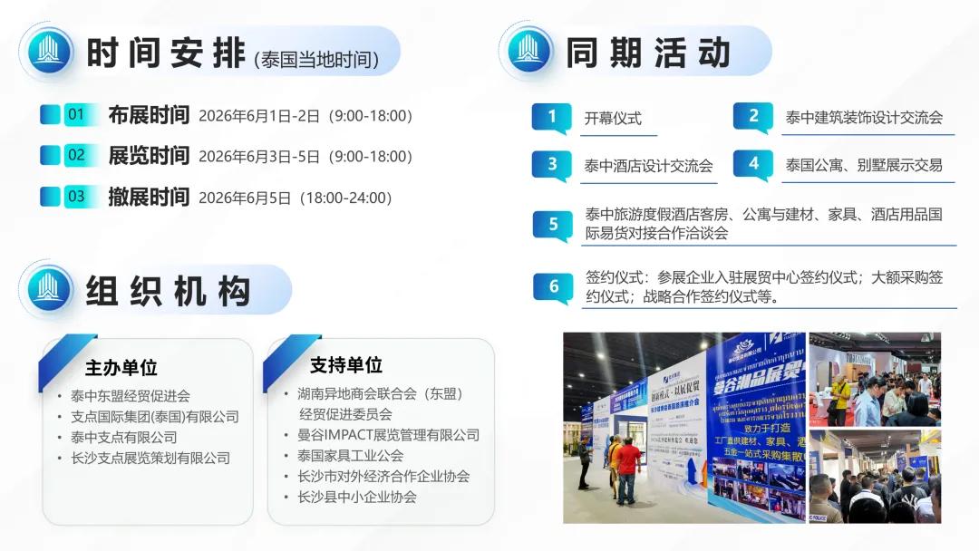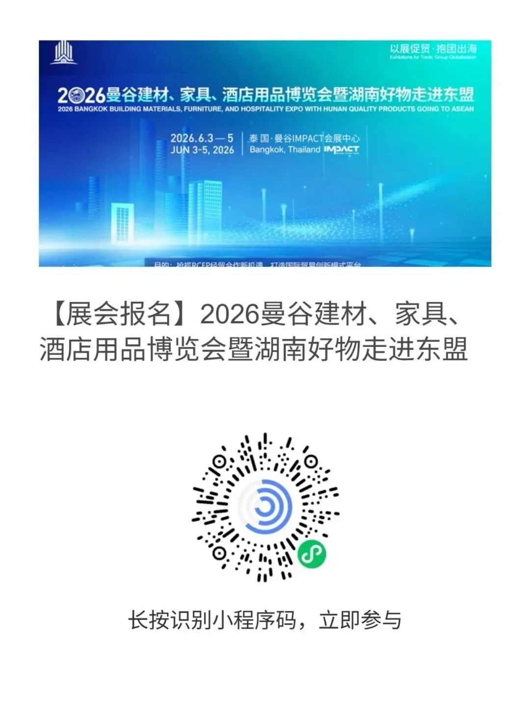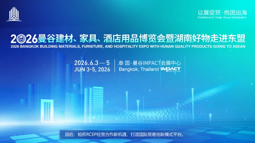2026曼谷建材、家具、酒店用品博览会暨湖南好物走进东盟将于2026年6月3-5日,在泰国·曼谷IMPACT会展中心(7号馆)举行。