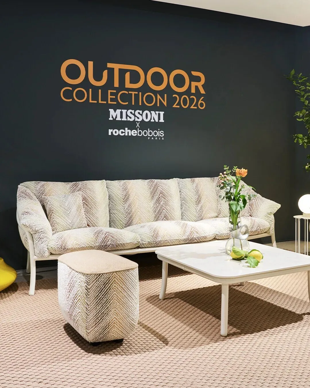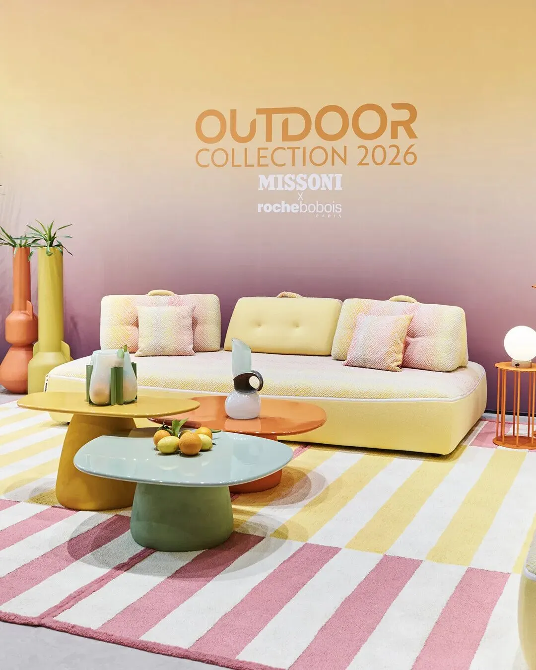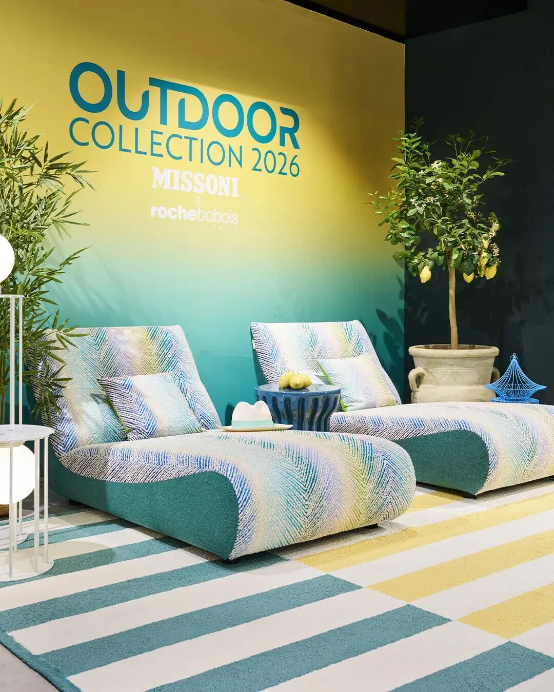 这是Roche Bobois 与 Missoni 携手打造的 2026 Outdoor Collection(2026 户外系列),也是两大标志性品牌在米兰设计周推出的重磅联名之作。法国巴黎的顶级家居品牌 Roche Bobois,以大胆前卫的设计语言和艺术化表达著称;而意大利传奇品牌 Missoni,则以标志性的彩色条纹与针织美学风靡全球。这次跨界合作,将 Missoni 经典的高饱和色彩与几何纹样,融入 Roche Bobois 的模块化户外家具设计中,打造出兼具品牌辨识度、艺术感与全气候耐用性的户外生活系列,让奢华、个性与舒适,延伸至庭院、露台的每一处户外空间。