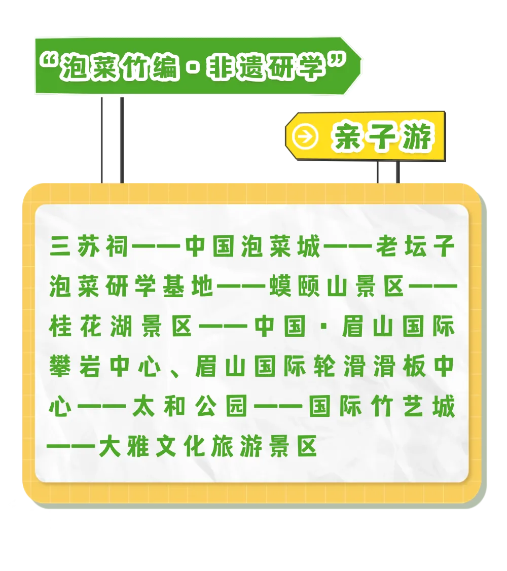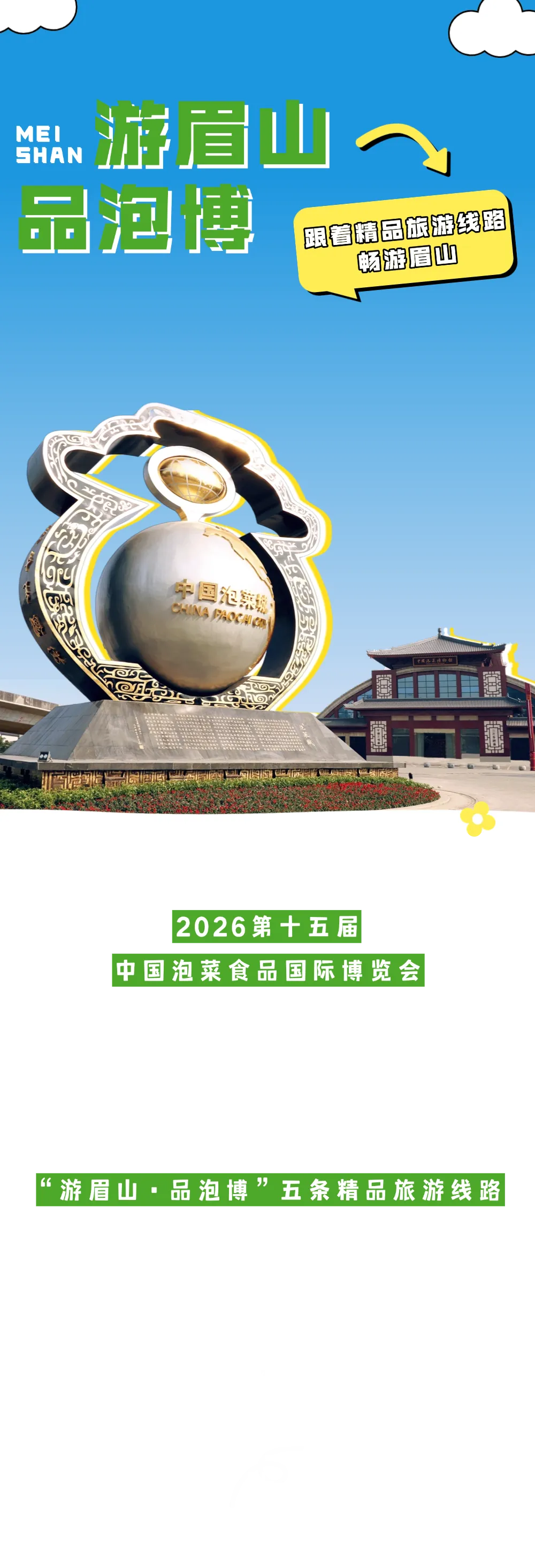 走进中国泡菜城,参观中国泡菜博物馆,了解千年东坡泡菜文化,解密泡菜起源之谜;前往老坛子泡菜研学基地,参观有泡菜兵马俑之称的“千坛车间”,进老坛子非遗传习馆了解乳酸菌知识,和孩子一起亲手制作东坡泡菜,把眉山味道带回家;进眉山会展中心,逛泡博会,选购各式特色泡菜。