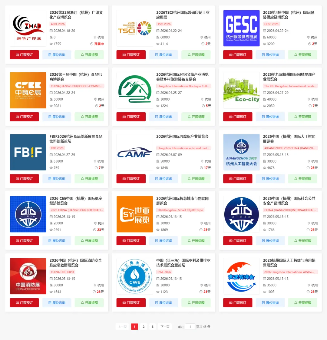 5月杭州将举办多场重要的展会活动,涵盖了印花、服装、食品、民宿、食品、园林、汽车配件、大数据、安全、消防、智能制造、水利、低空经济、智慧城市、机器人、家具、日用品、工业、国内电商、酒店用品、食品、餐饮、汽车、内衣、纺织展等多个领域。小编为大家整理了5月杭州展会时间表,希望能帮助你规划行程。末文获取杭州展会门票预约入口~(大多展会限时免费预约)