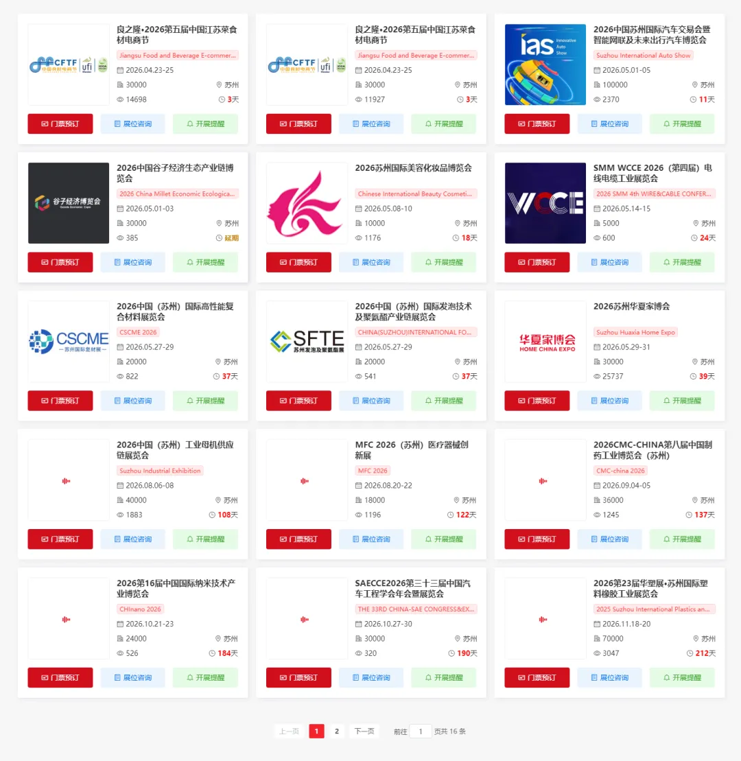 5月苏州将举办多场重要的展会活动,涵盖了食材、汽车、美容、电线电缆、复合材料、新材料、家具、机床、医疗器械、制药、新材料、汽车、橡塑、农业展等多个领域。小编为大家整理了5月苏州展会时间表,希望能帮助你规划行程。末文获取苏州展会门票预约入口~(大多展会限时免费预约)