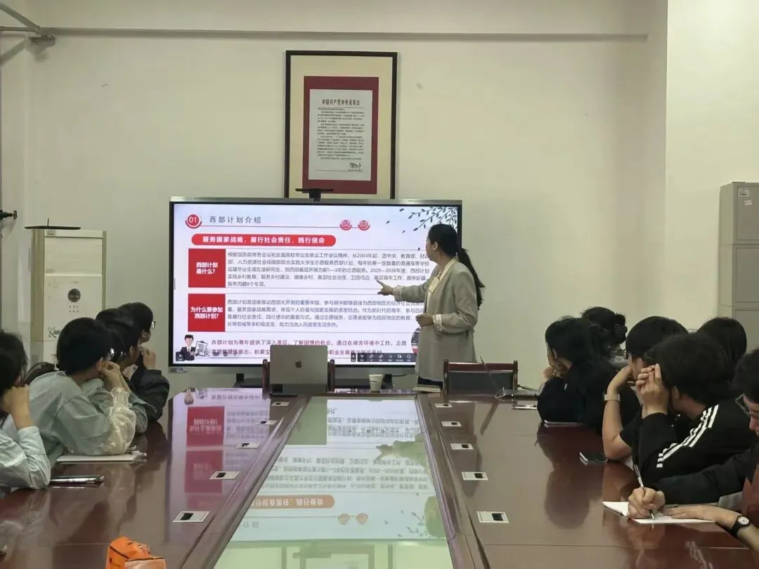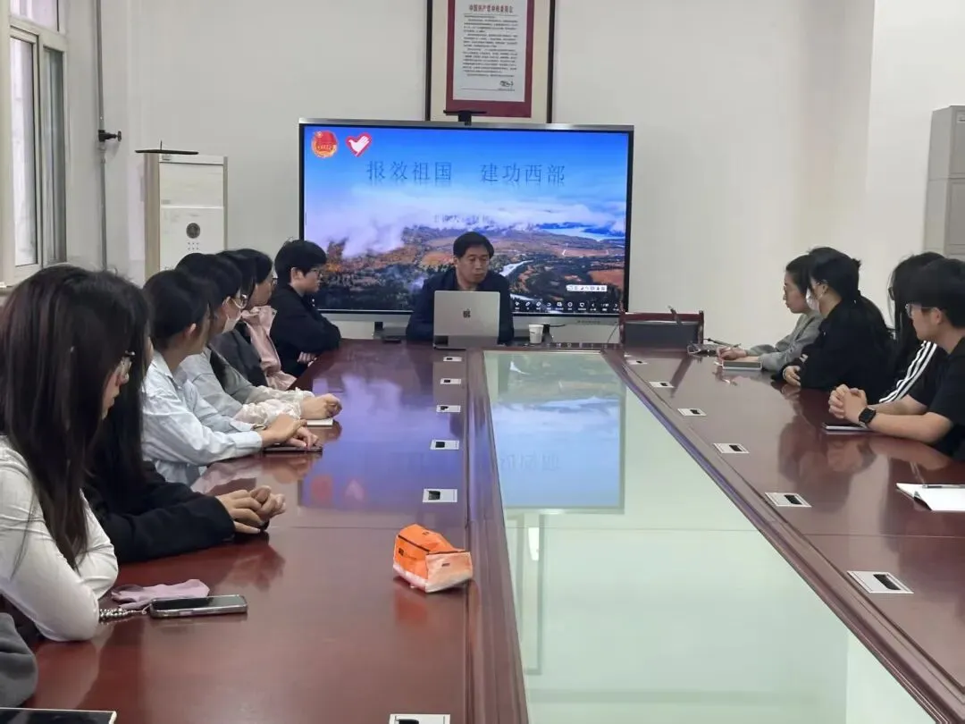 为深入贯彻国家西部计划号召,引导青年学子扎根基层、奉献祖国,树立崇高职业理想与人生追求。保定学院马克思主义学院于4月21日上午九点在C125线上线下同步举办“西部计划”推介会。本次活动特邀校团委赵杨老师为同学们深度解读政策内涵、分享志愿故事,马克思主义学院党总支书记彭晓峰、副书记吴宗宅,辅导员刘洋及2026届毕业班同学参会。