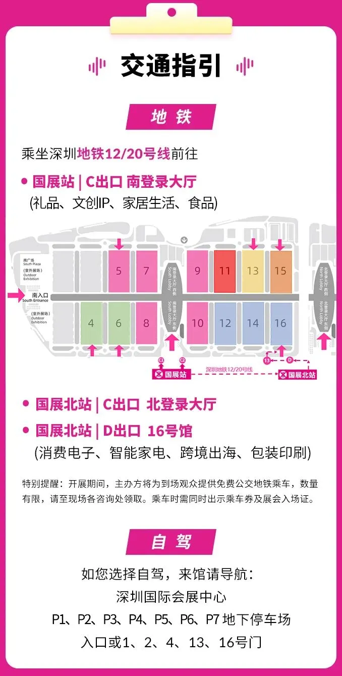 自驾:请导航至深圳国际会展中心P1/P5/P6停车场入口。