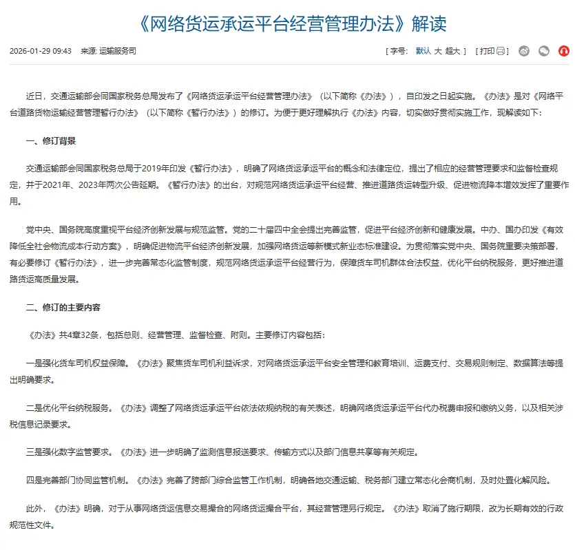 为什么曾经大行其道的开票模式会失效,这些看似不起眼的操作会触发稽查?核心在于监管的底层逻辑已经发生了根本性的转变,从过去的 “以票管税” 全面转向 “以数治税”—— 用技术手段管控业务数据,用真实数据规范运输全流程。2026 年落地的《网络货运承运平台经营管理办法》,取代了 2019 年的暂行管理办法,新规并非监管力度加码,而是监管方式更精准、更细化,具体体现在三个核心转变上:1. 监管精度细化至单张运单