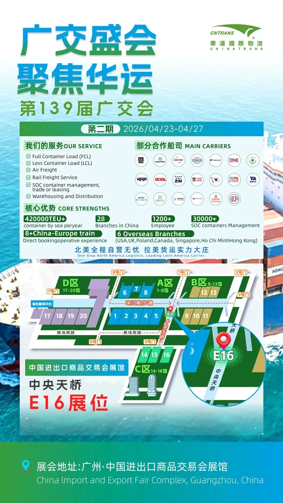 二期盛会启幕|华运Chinatrans广交会诚邀莅临天桥E16琶洲风起,万象汇商!第139届广交会第二期正式开展。深圳华运国际物流Chinatrans携美加、拉美专线、海运空运、DDP门到门、一站式跨境物流全方案亮相展会。多年深耕全球货运,我们以稳定舱位、高效清关、全程追踪、定制化物流服务,助力外贸企业无忧出海。4月23-27日,广州琶洲,华运团队全程驻场,一对一运价咨询、合作洽谈、物流方案定制,诚邀海内外新老客户莅临交流,携手共赢!展会时间:2026.4.23-4.27展会地点:广州琶洲广交会展馆E16 (天桥区) The 139th Canton Fair Phase 2 is grandly open in Pazhou!Shenzhen Chinatrans Group brings full-range global logistics solutions: US/Canada & Latin America routes, ocean & air freight, DDP door-to-door, all-in-one cross-border shipping with complete customs clearance.With rich logistics experience, stable capacity, efficient brokerage and whole-process tracking, we empower global traders with reliable export services.From April 23 to 27, our professional team is on-site in Guangzhou for exclusive rate consultation, business discussion and customized shipping plans.Sincerely welcome all partners worldwide to meet us!Dates: Apr 23-27, 2026Venue: Canton Fair Complex, Pazhou, Guangzhou booth E16