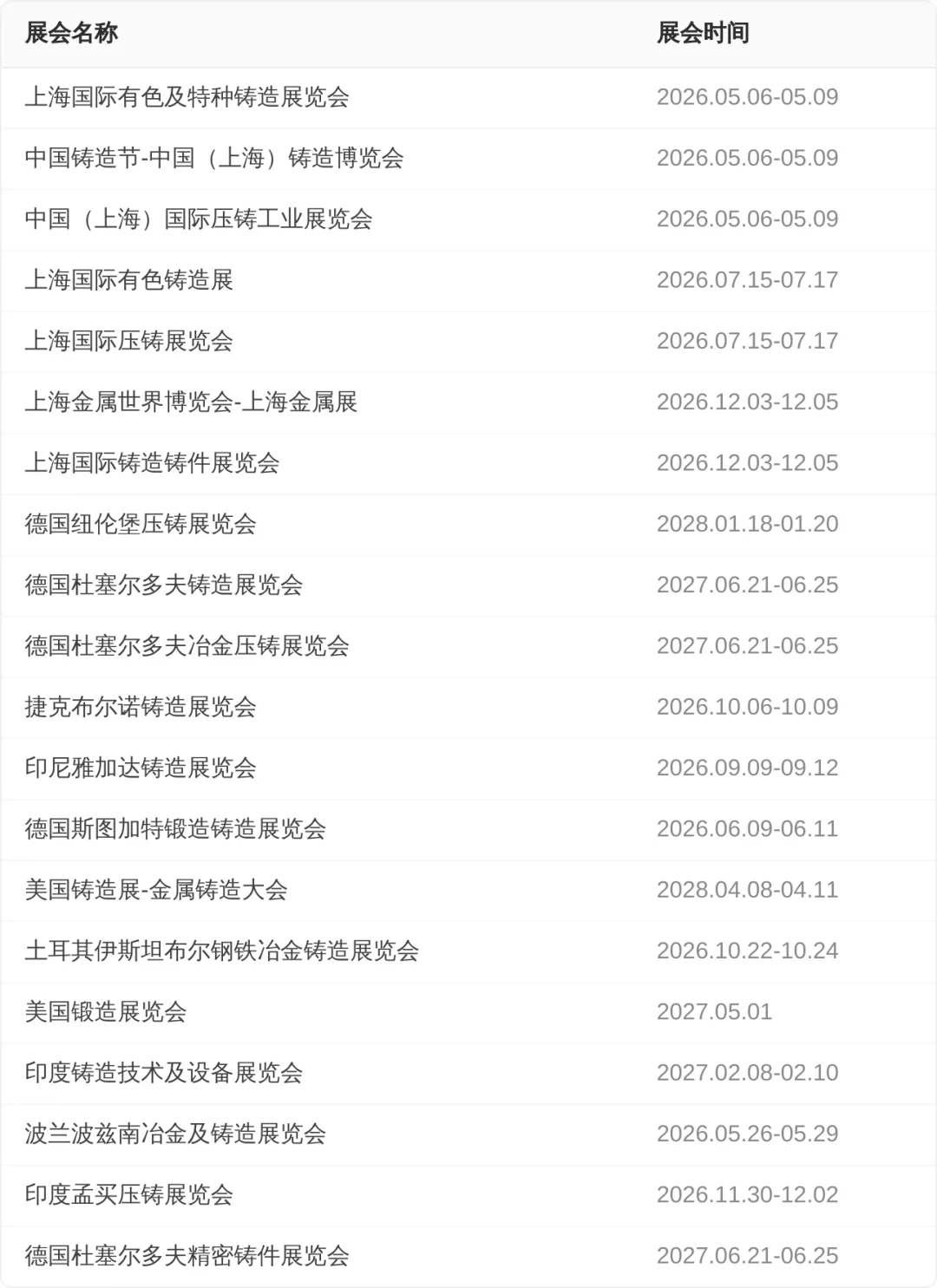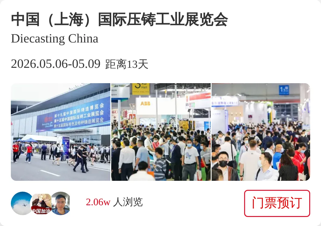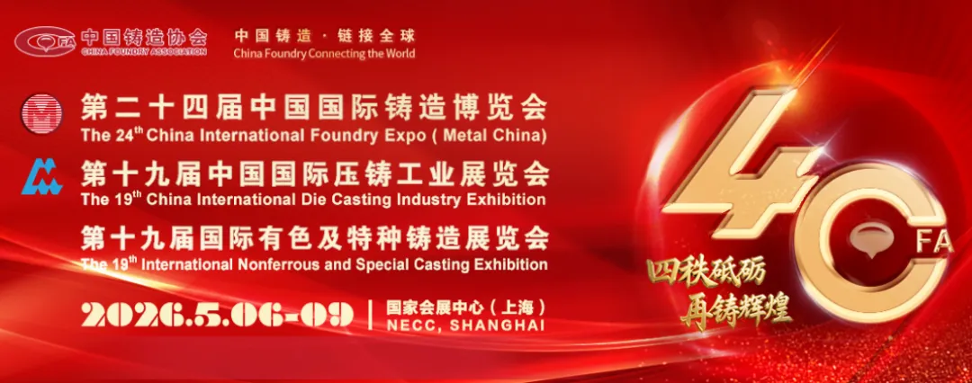 秉承行业引领、创新发展、服务行业的宗旨,第二十四届中国国际铸造博览会、第十九届中国国际压铸工业展览会、第十九届国际有色及特种铸造展览会将于2026年5月6-9日在国家会展中心(上海)盛大举办。门票观众预登记进行中~