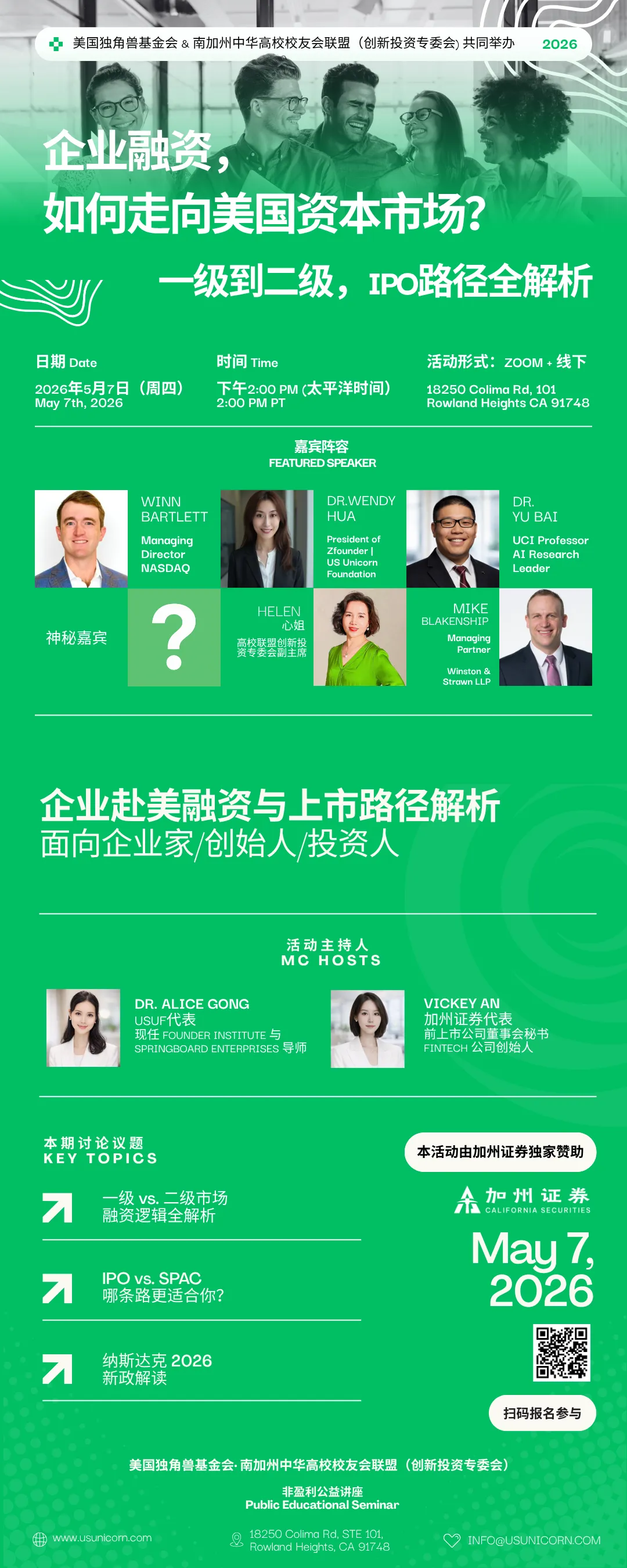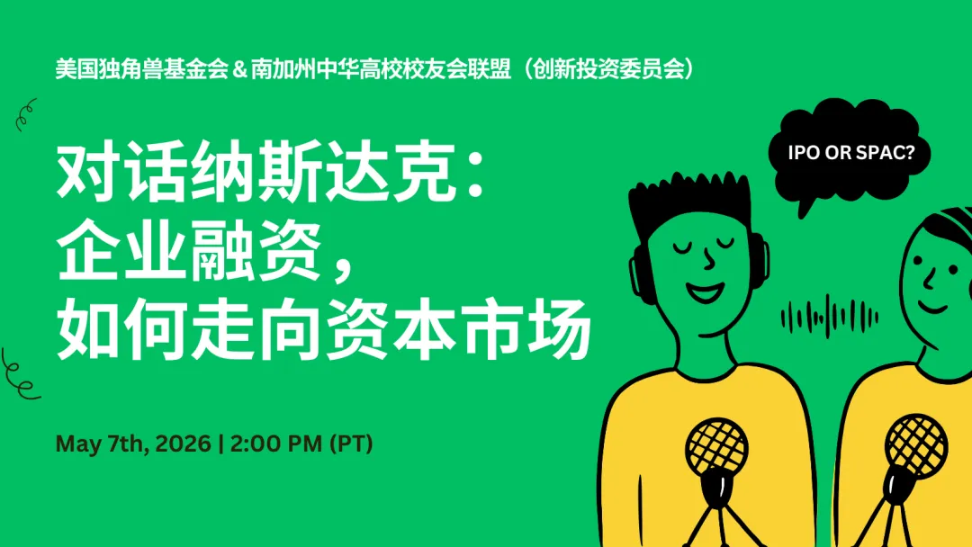 2026年5月7日,美国独角兽基金会将联合南加州中华高校校友会联盟(创新投资专委会),邀请多位来自交易所、投资机构、法律界与学术界的一线嘉宾,共同带来一场面向企业家、创始人、投资人的资本市场公开分享。