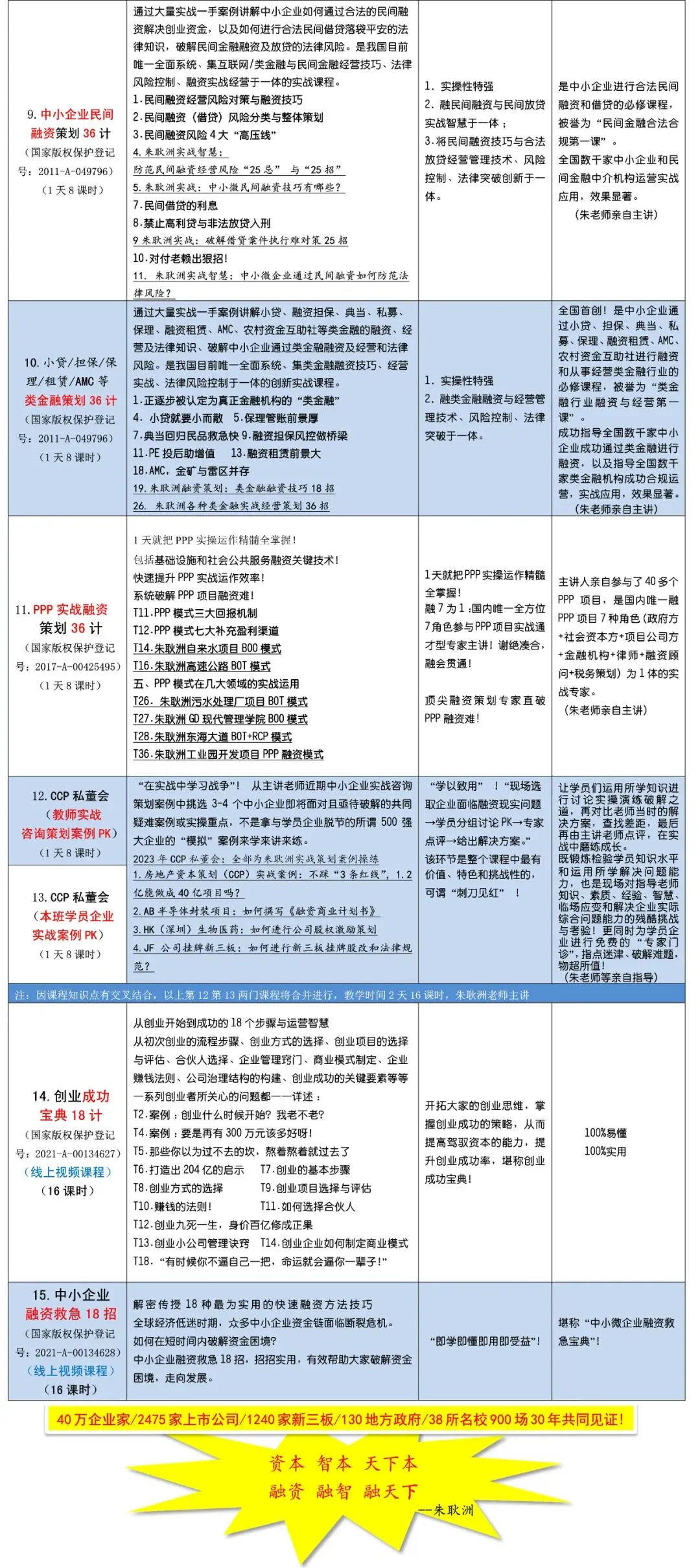 朱老师是清华大学、北京大学、香港大学、中山大学、人民大学、复旦大学、浙江大学、暨南大学、上海交大、上海财大、湖南大学、清华大学深圳研究生院、深圳清华大学研究院、清华大学长三角研究院、北京大学汇丰商学院、浙江财大、宁波理工学院、武汉大学、华中科技大学、西南财大、西南交大、西安交大、重庆大学、山东大学、山东财大、内蒙古大学、石河子大学、厦门大学、华侨大学、南昌大学、江西财大、江西省委党校、海南大学、云南大学、南京师范大学等30多所高校及国内知名培训机构、PPP项目融资、金融投融资资本运作、PE/VC、民间金融、互联网金融、房地产、工商管理总裁班EMBA等主讲专家、客座教授,全国巡讲超900场次,40多万学员见证融资策划36计课程的神奇魅力!