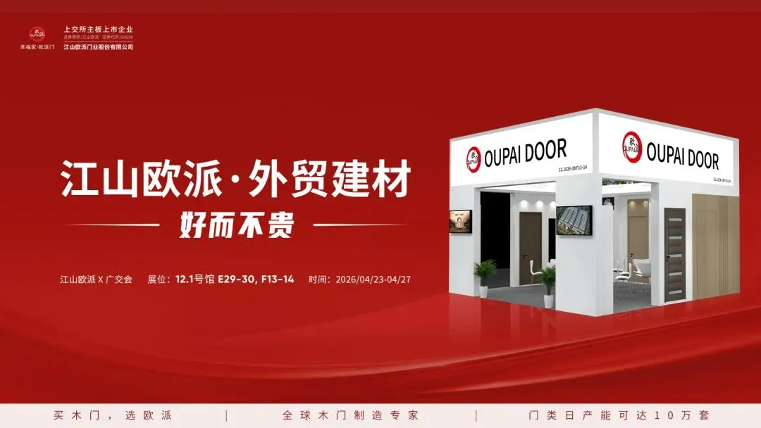 2026 年 4 月 23 日,第 139 届中国进出口商品交易会(广交会)第二期将在广州琶洲国际会展中心盛大启幕。本届展会以 “品质家居”为核心,聚焦家居行业创新设计、绿色低碳与安全升级。江山欧派作为上交所主板上市企业,一直以“全球木门制造专家”为己任,将携PVC木门、WPC木塑门及美标防火门隆重亮相广交会,以中国智造赋能全球品质家居,用安全与美学链接世界商机!