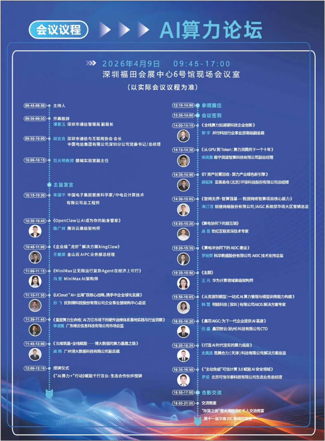 2026年4月9日,为期三天的2026第三届AI算力产业大会暨展览会在深圳成功举办。本次大会由深圳市数字经济产业促进会、中国计算机行业协会数据存算专委会、上海市节能环保服务业协会绿色数据中心专业委员会液冷工作组、深圳市通信与互联网协会联合主办,数据中心世界网、AIDC Market、DCMap协办,深圳热点资讯展览有限公司承办。会议以“算力领航 赋能千百行业”为主题,汇聚国内外顶尖科技企业、学术领袖、产业专家及政策制定者,共同探讨AI算力技术突破、产业融合与生态共建。
