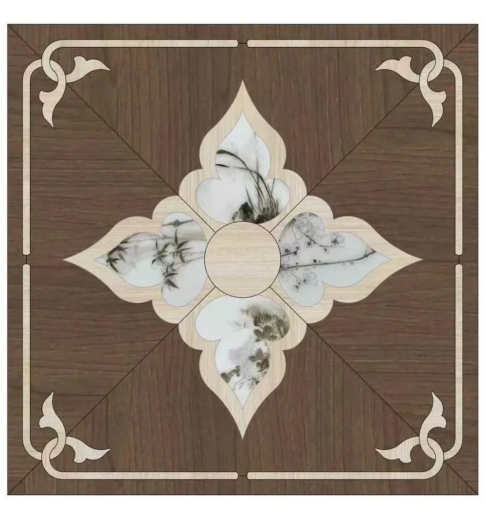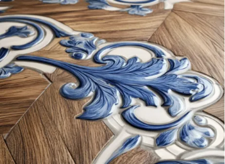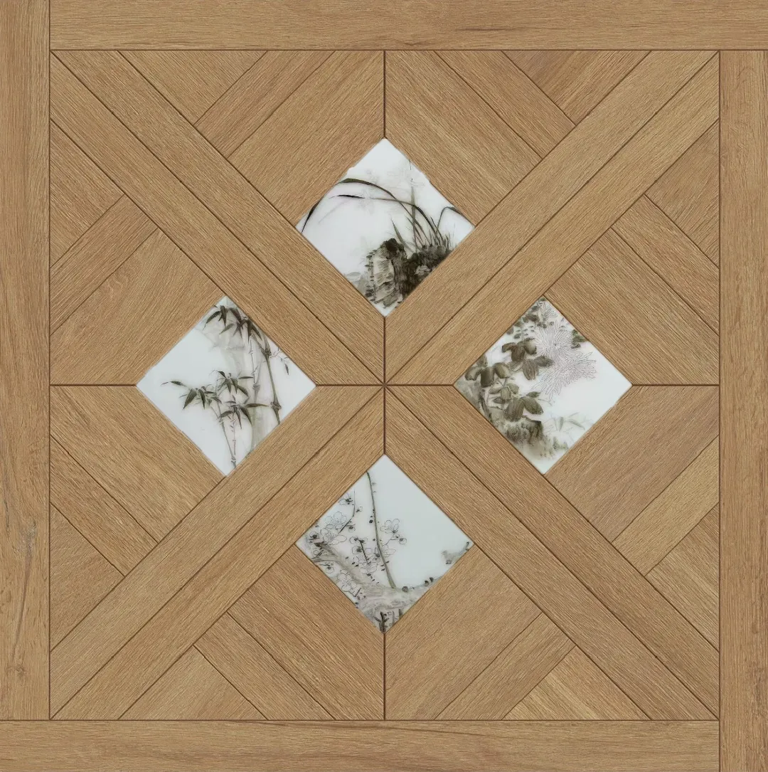 《瓷木共生》系列:延续景德镇白瓷与珍稀木材的碰撞,将中式缠枝纹与现代极简线条结合,打破传统地板的实用边界,成为高端私宅与艺术空间的首选。