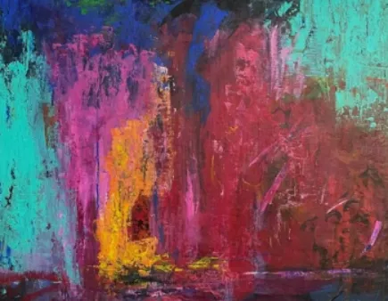 《Ethereal Journey》(2023)丙烯画布,36×24 英寸。梦幻紫蓝与金红流彩,如中东晨光与建筑光影,抽象却饱含故土温度,东方意境完美共鸣。