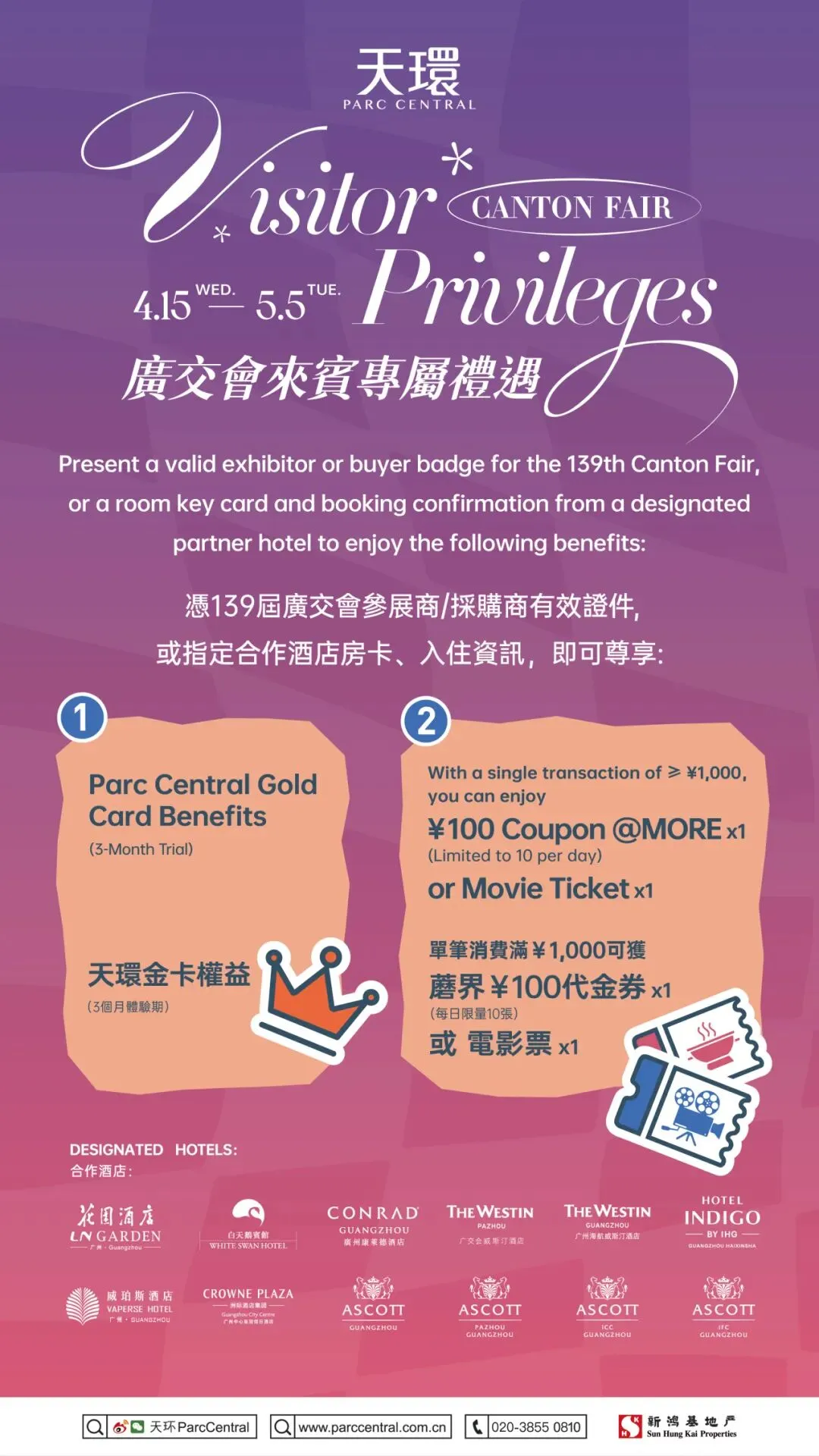 同時に、天環は提携ホテルを拡大しており、今回は10以上のホテル・サービスアパートメントと提携しています。広州白天鹅賓館、広州花園酒店、広州コンラッドホテル、ベイパースホテル広州、広州広州交易会ウェスティンホテル、ウェスティン広州、広州中心クラウンプラザホテル、ホテルインディゴ広州海心沙、広州アスコット琶洲サービスアパートメント、広州アスコットサービスアパートメント、広州環貿中心アスコットサービスアパートメント、広州国際金融中心アスコットサービスアパートメント。宿泊情報またはルームキーを提示すれば、同じく広州交易会来場者限定特典を利用できます。