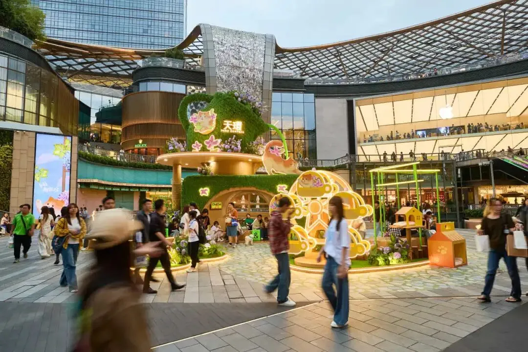 天環のL1階およびB1階の屋外は、ペットのための「秘密の花園」に変身しています。50メートルの花の小径が段々と下っていき、巨大な猫、はちみつ犬、ビーサンを履いた猫など、かわいらしいキャラクターが続々登場します。高さ7メートルの2階建てコップ型ツリーハウスは緑に囲まれ、木綿の花をあしらった子猫が広州特有ののんびりした雰囲気を醸し出しています。ここは地元のペットオーナーとペットたちの遊び場であるだけでなく、来場者の散策や休憩スポットにもなります。