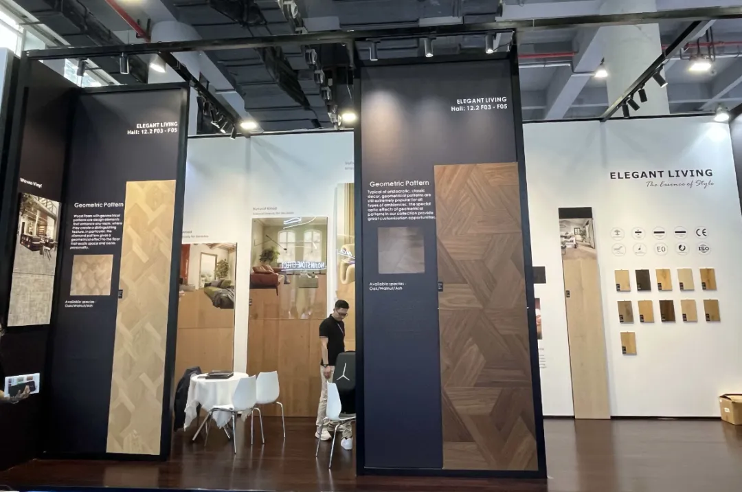 走进生活家地板的展位,仿佛步入了一座地面艺术的陈列馆。在本届广交会上,生活家敏锐捕捉到了国际市场从“实用主义”向“美学经济”转型的趋势,重点展示了异形拼花实木多层地板系列。