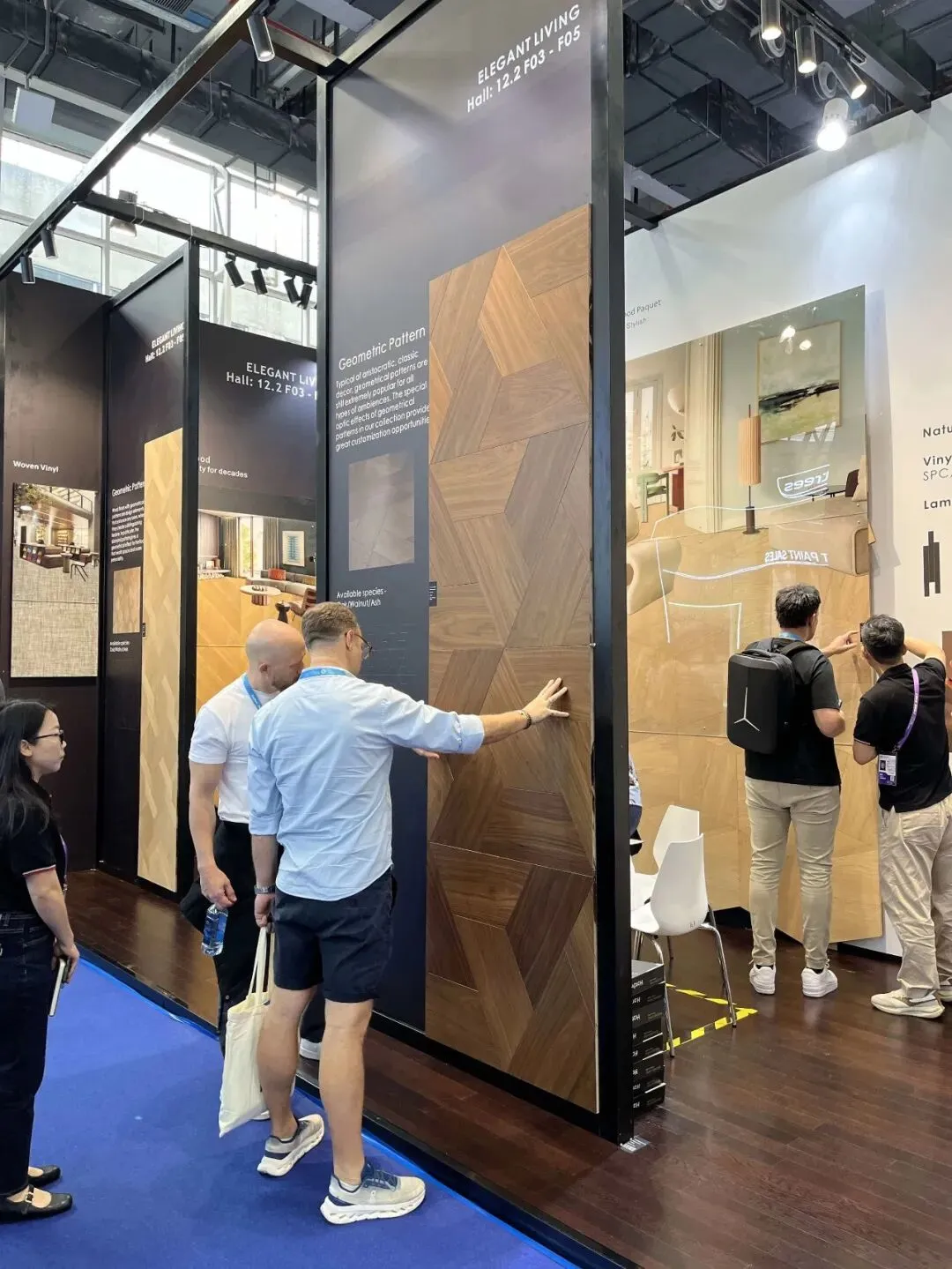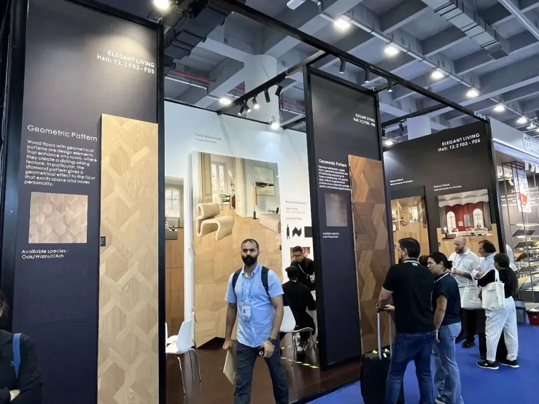 与以往展出的人字拼、鱼骨拼不同,本届广交会展出更为复杂的艺术异形拼接——中国结拼,田字拼、梯形拼等多种前沿工艺。这些产品通过巧妙的几何排列,打破了空间的呆板感,赋予地面强烈的立体延伸感与艺术张力。无论创意双拼人字拼,还是错落有致的创意方格拼,都精准击中了海外采购商对现代家居空间个性化、场景化的高颜值需求。