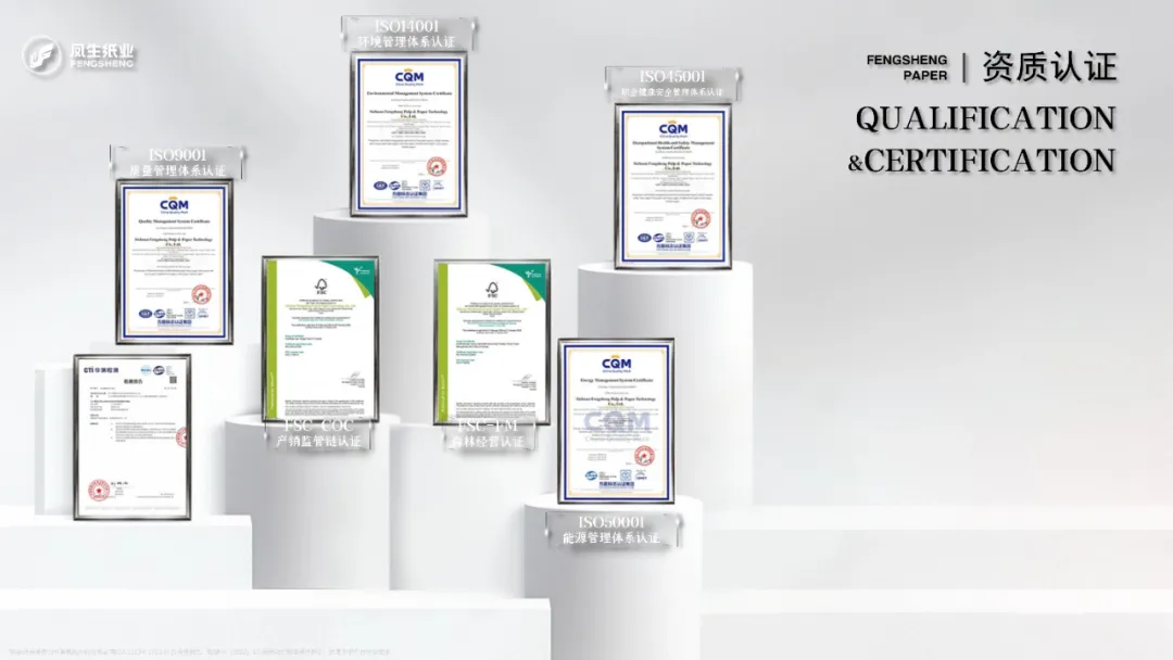 作为农业产业化国家重点龙头企业、国家工信部绿色工厂[3],凤生纸业建立了完善的质量管理与环境管理体系,已通过ISO9001、ISO14001、ISO45001、ISO50001、FSC-FM、FSC-COC、BSCI社会责任认证。
