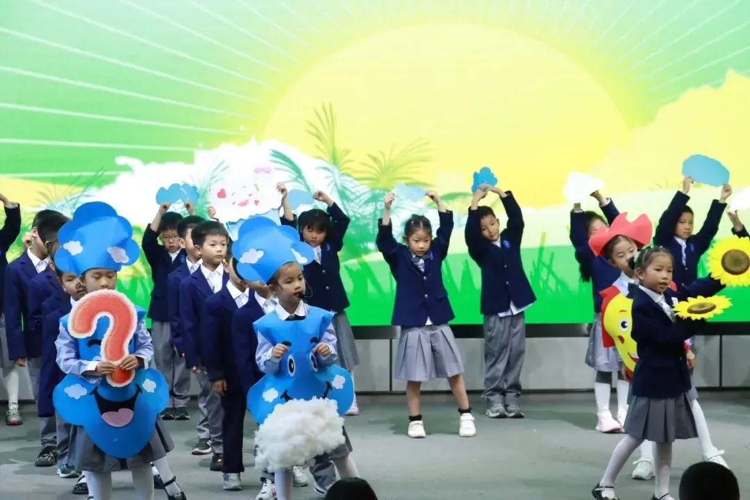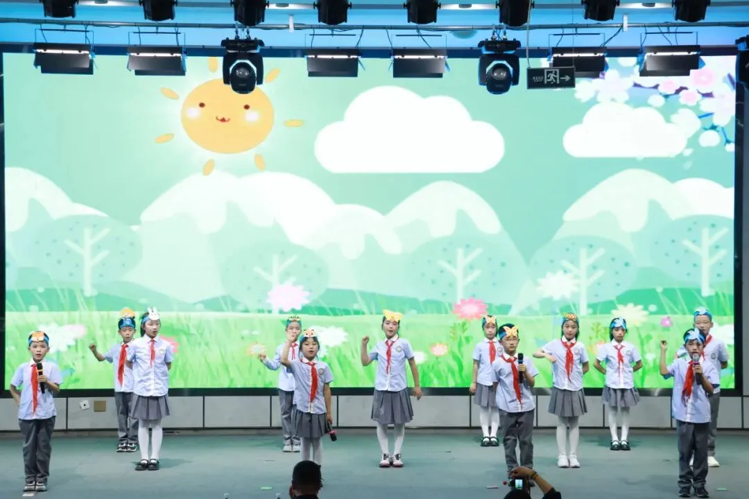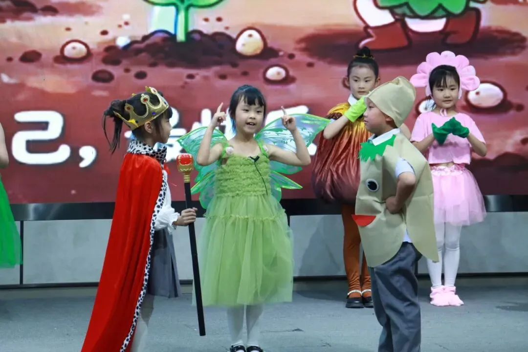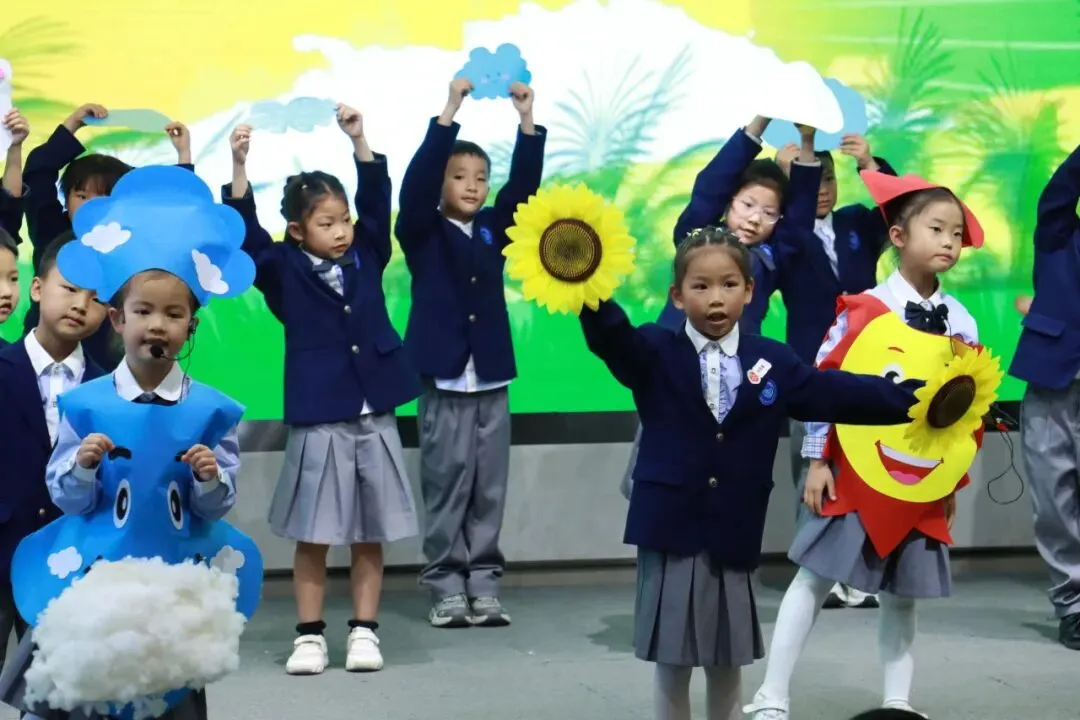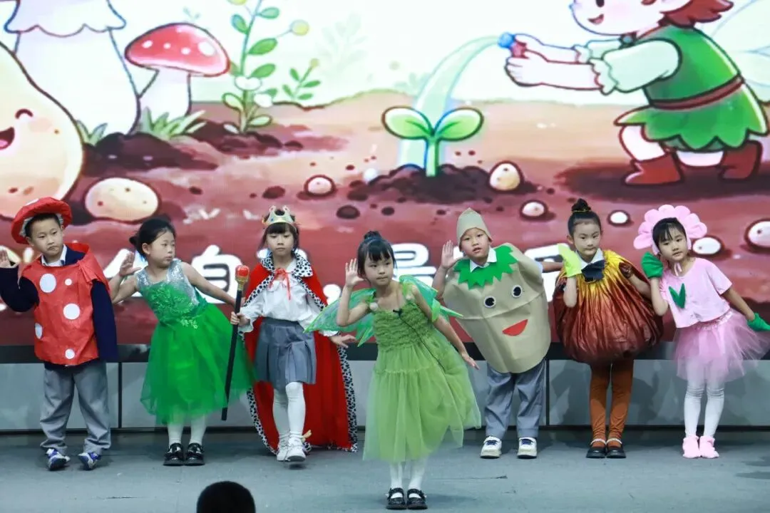 一年级以“金木水火土”为脉络,将自然童诗化为五部亲子情景剧,稚子化身精灵,童声叩问天地。