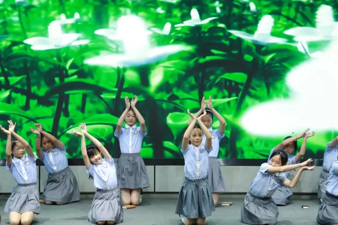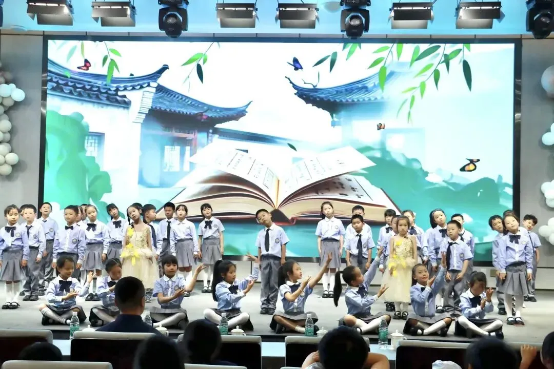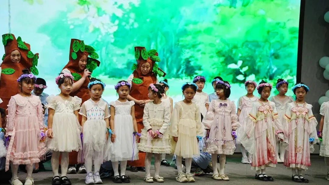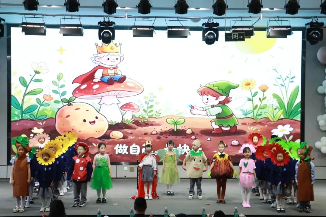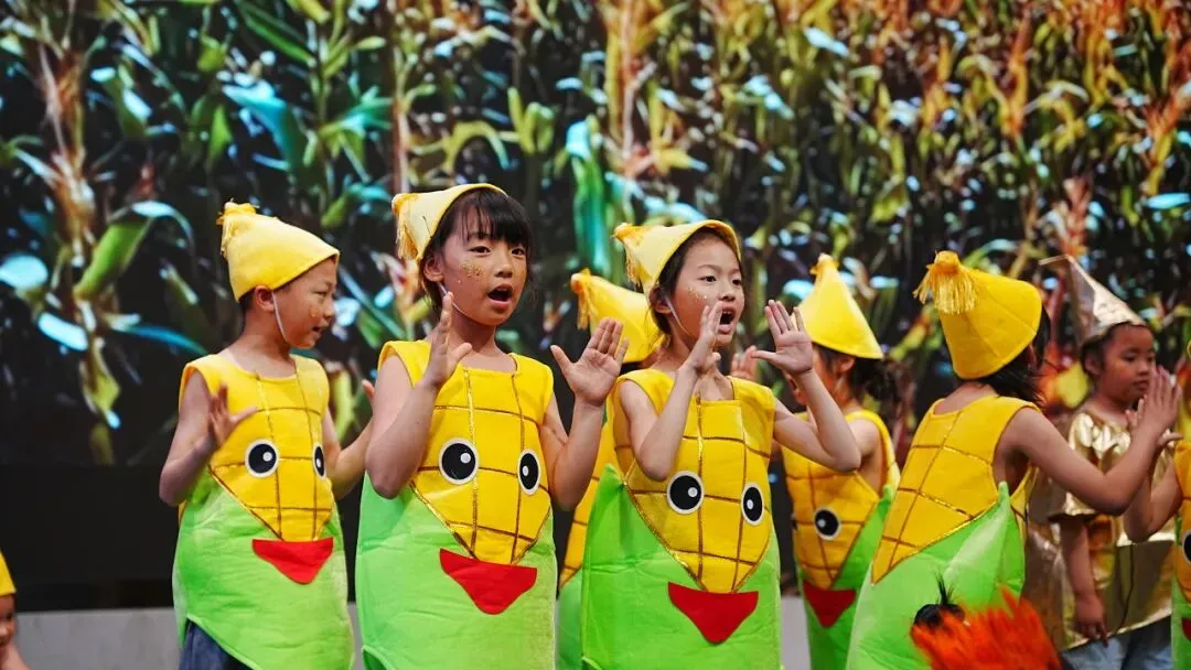一年级以“金木水火土”为脉络,将自然童诗化为五部亲子情景剧,稚子化身精灵,童声叩问天地。