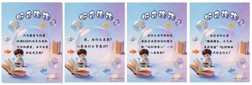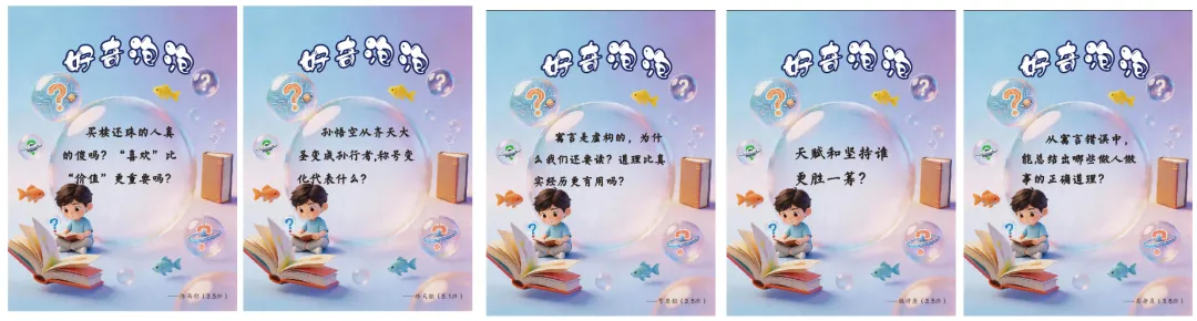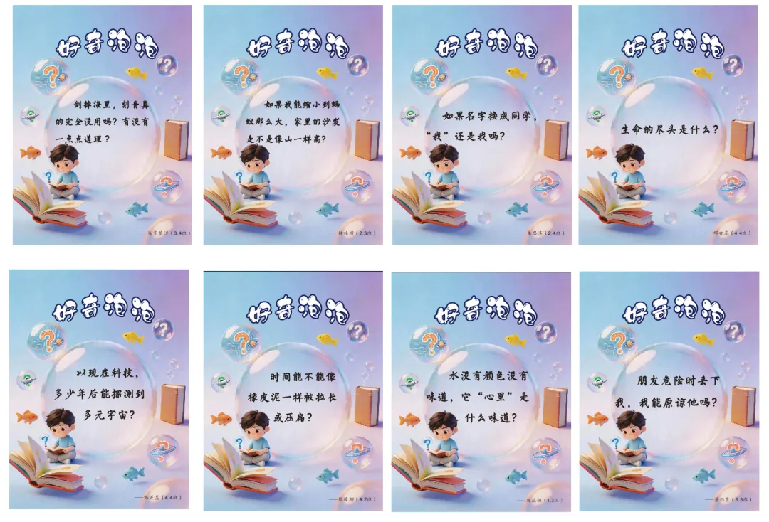 为了提升孩子的思维品质和提问质量,全校征集了近千个问题,经过集中评审,98颗“好奇泡泡”闪亮诞生。从宇宙到自我、从科学到哲思,每一个问号都是孩子思维拔节的声音。