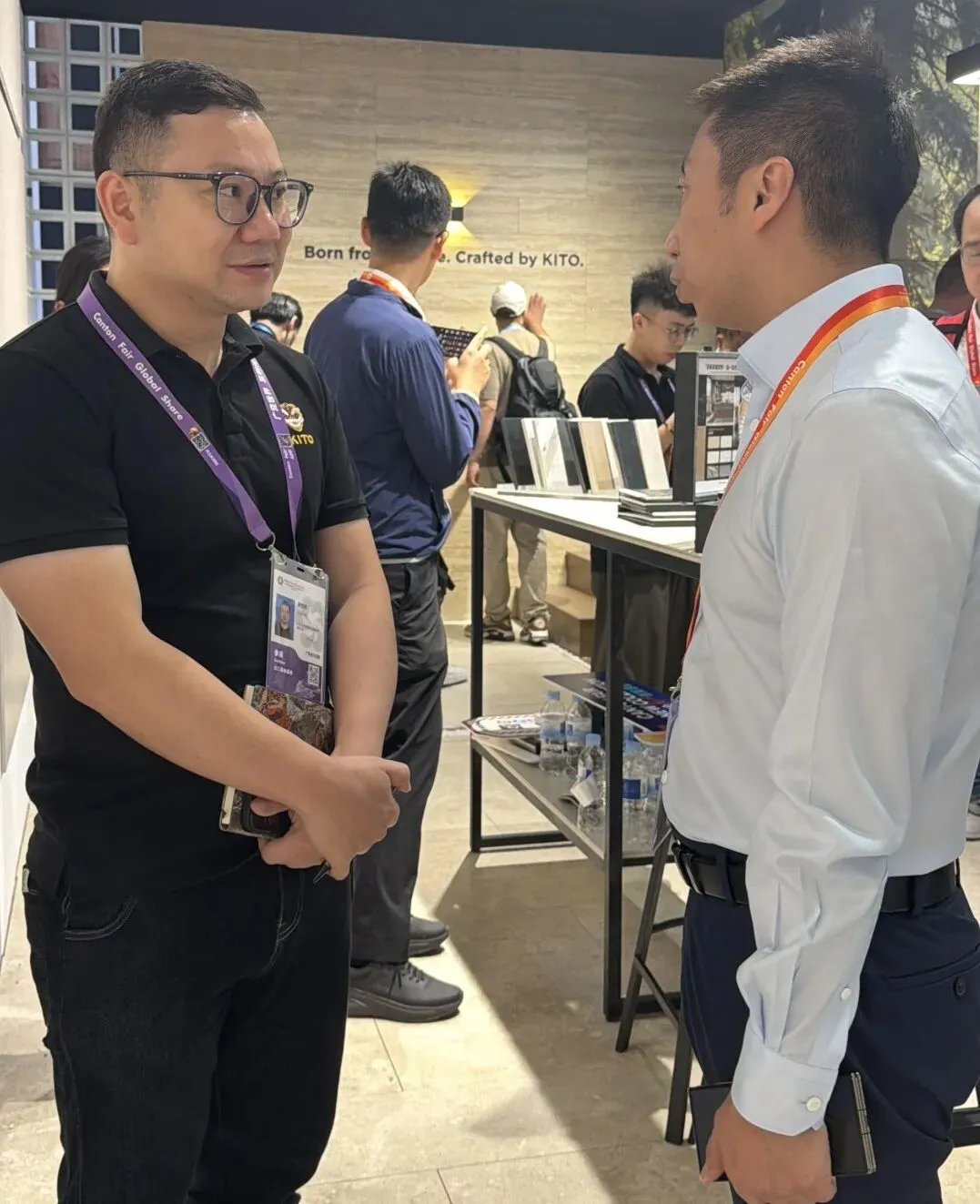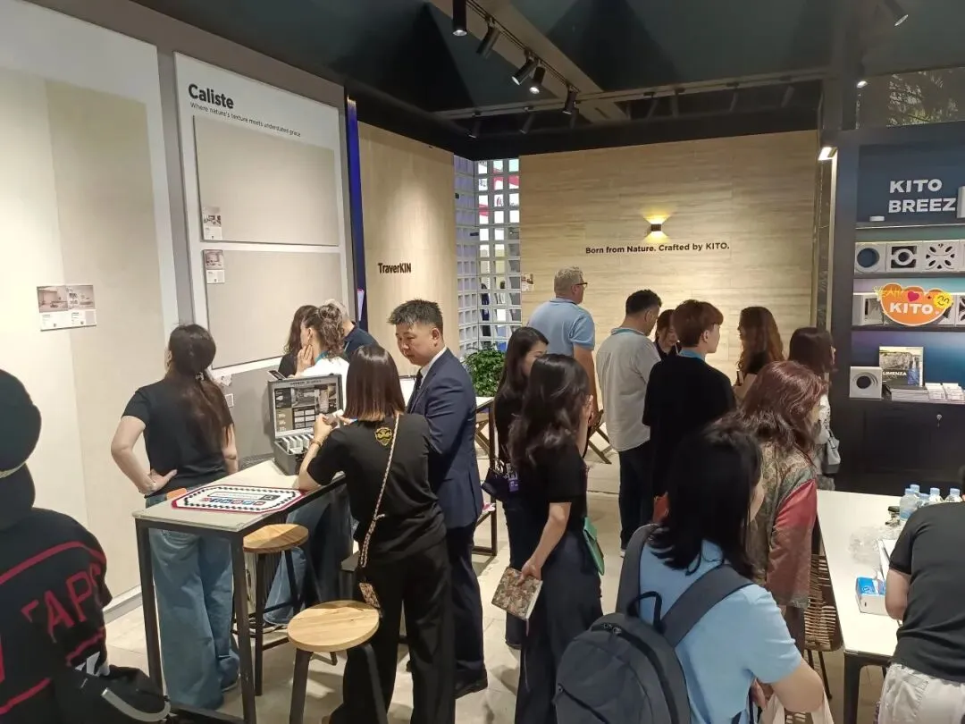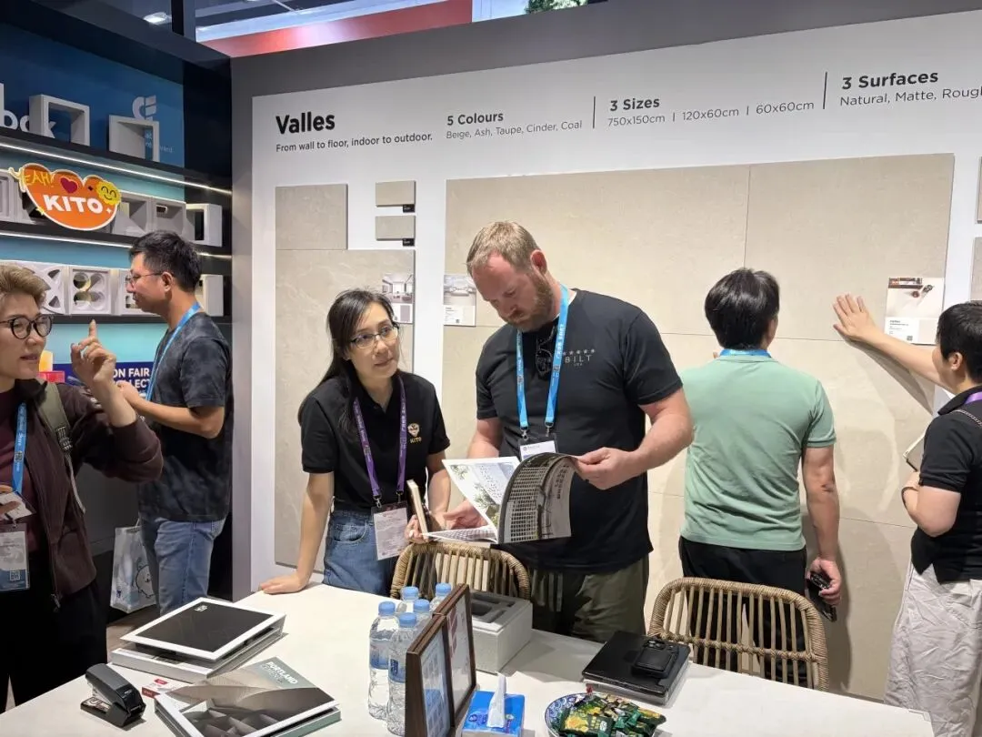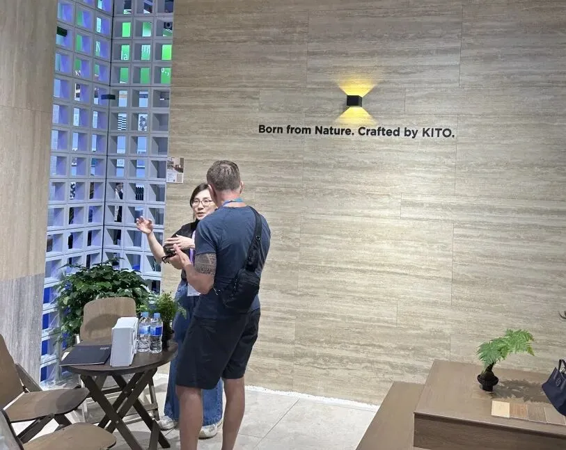 客商们亲身体验金意陶产品的魅力,走进实景模拟间,亲手触摸有洞洞石的凹凸与莱姆石的温润,感受远山臻木楼梯的质感。现场工作人员热情介绍产品细节,耐心解答疑问,为未来合作奠定良好基础。