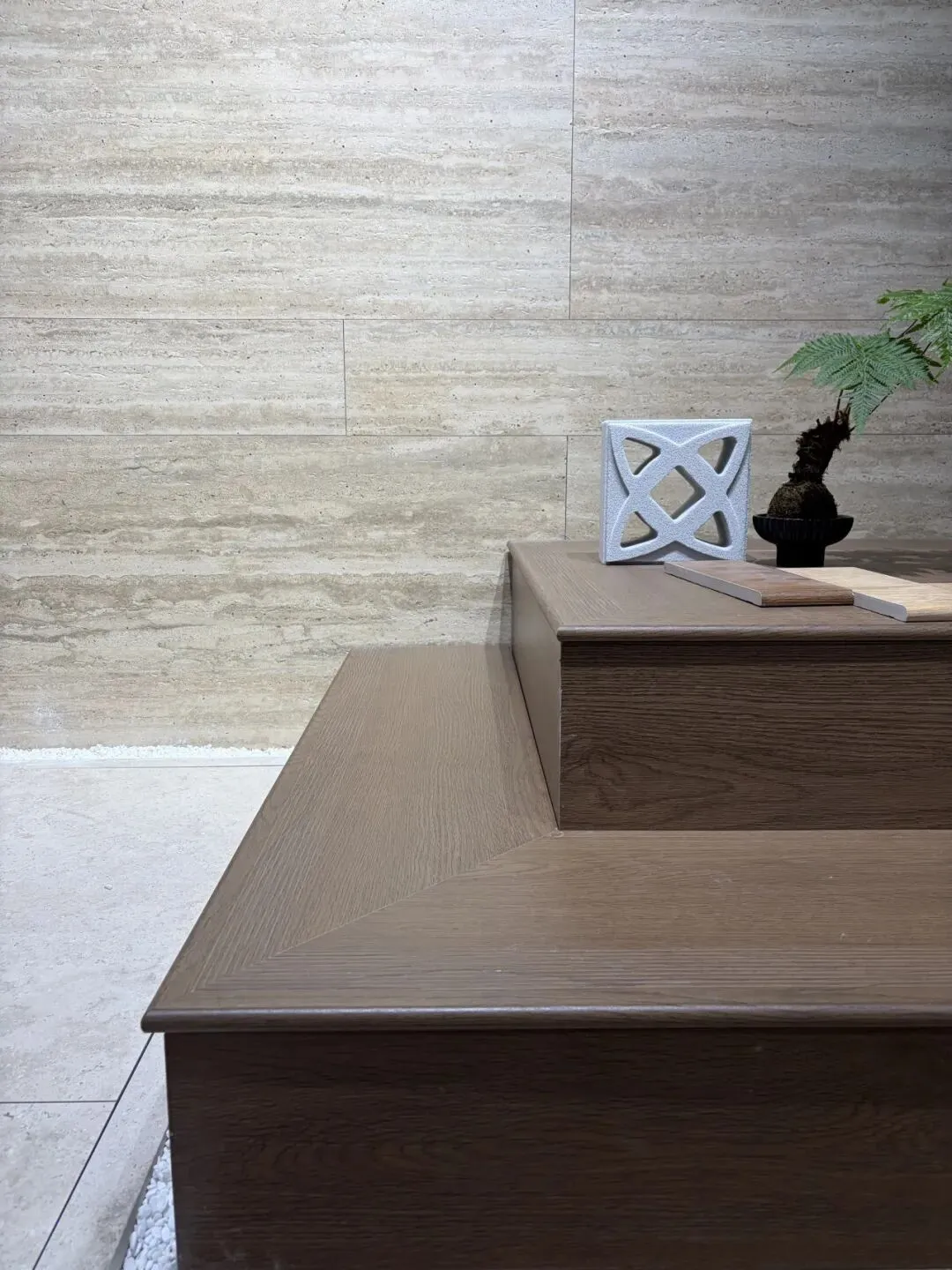 莱姆石以其低调的雅光质感与柔和的复合色彩,成为地面的最佳搭档。它与粗犷的洞洞石墙面形成刚柔并济的视觉反差,既提升了空间的层次感,又保持了整体色调的和谐统一。